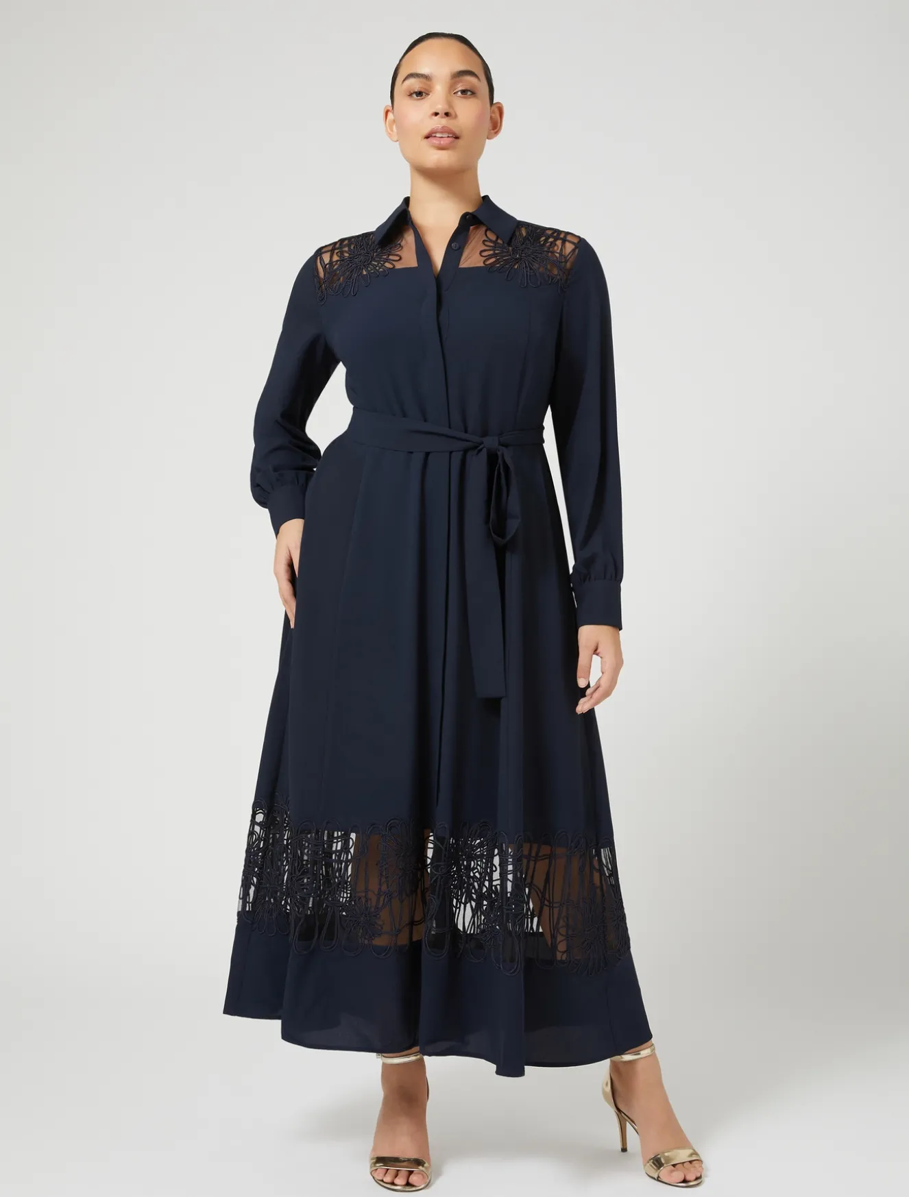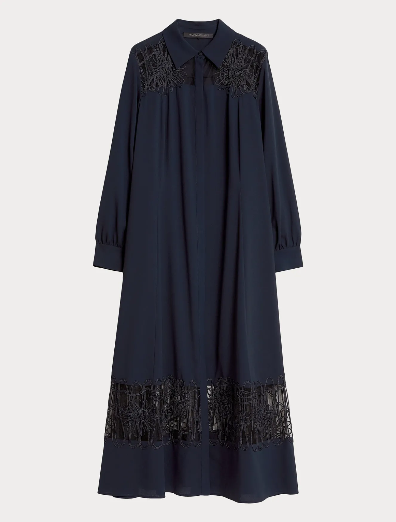 Ricamo cornely su tulle al carré e intarsiato al fondo per l’abito lungo chemisier in crêpe leggero. Lavorazione preziosa per un modello sofisticato da sfoggiare nelle occasioni speciali.Il capo fa parte della collezione Elegante.