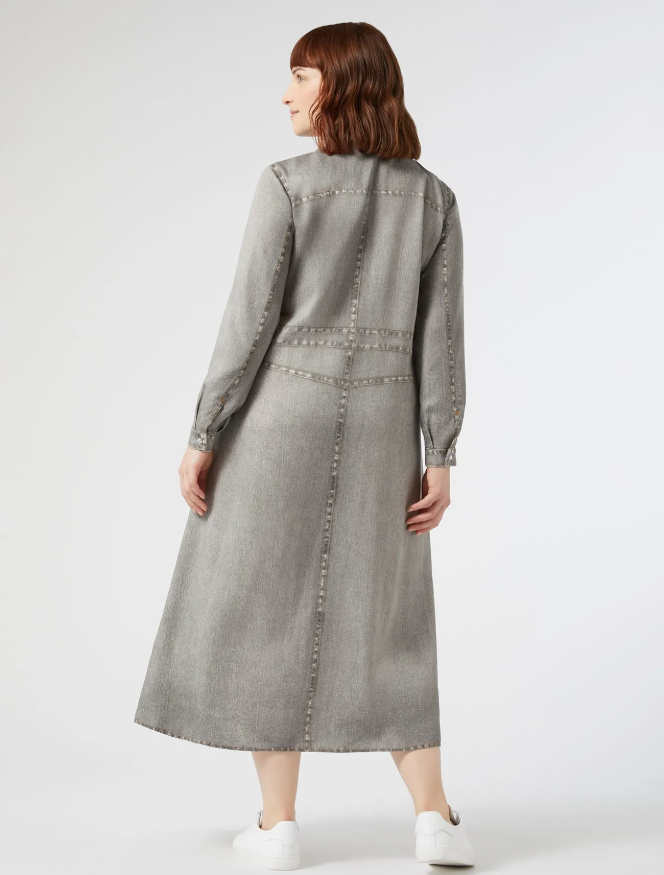 Stampa effetto denim per l’abito chemisier in raso di lyocell che riproduce le tasche e il carré davanti e dietro tipico del jeans. Tessuto ricercato e design inedito per look che non passano inosservati.