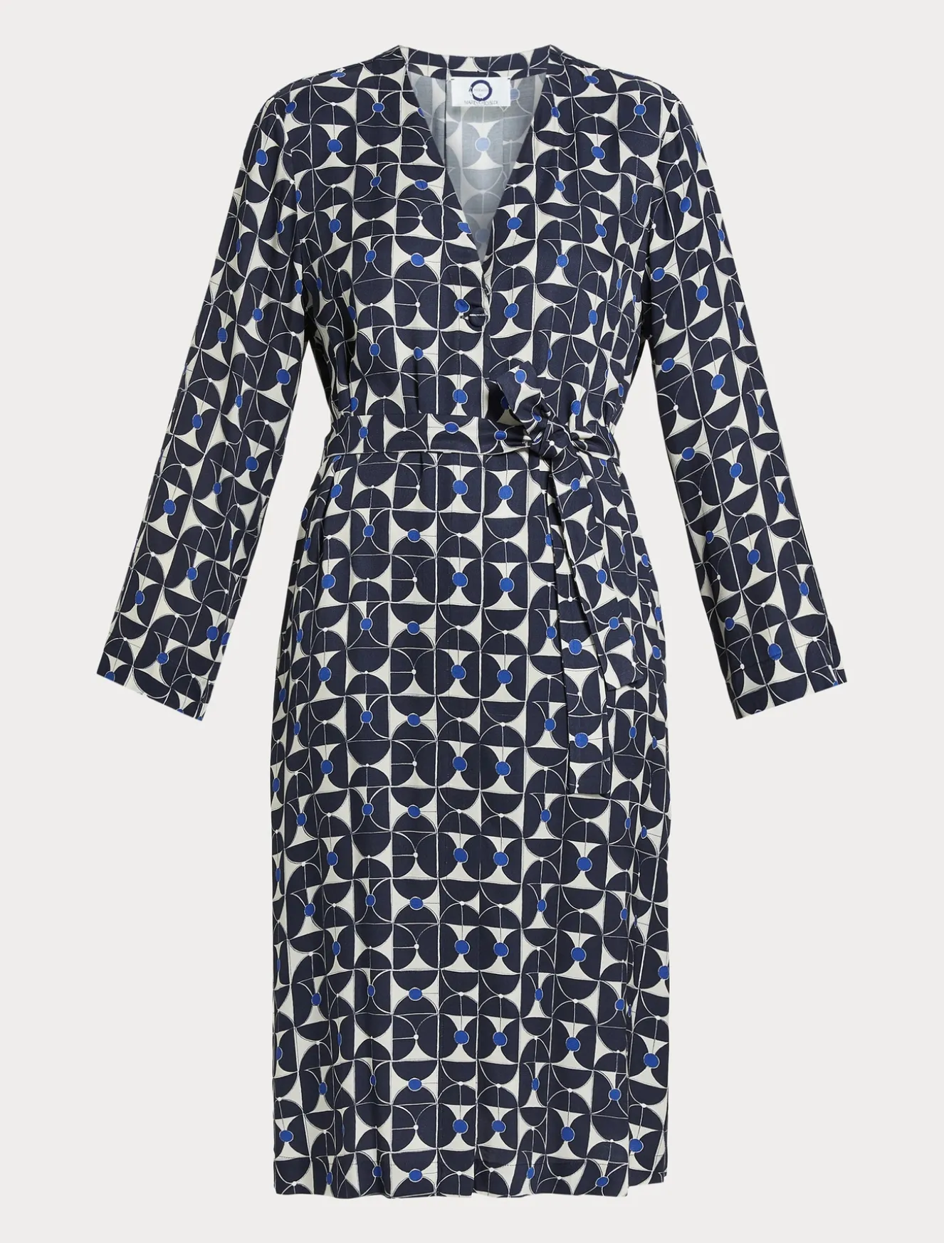 Stampa grafica esclusiva per l’abito chemisier in twill di viscosa, dalla linea svasata con contropiega sul retro. Lo puoi indossare con la fusciacca in coordinato da annodare al collo o in vita.Il capo fa parte della collezione Voyage.