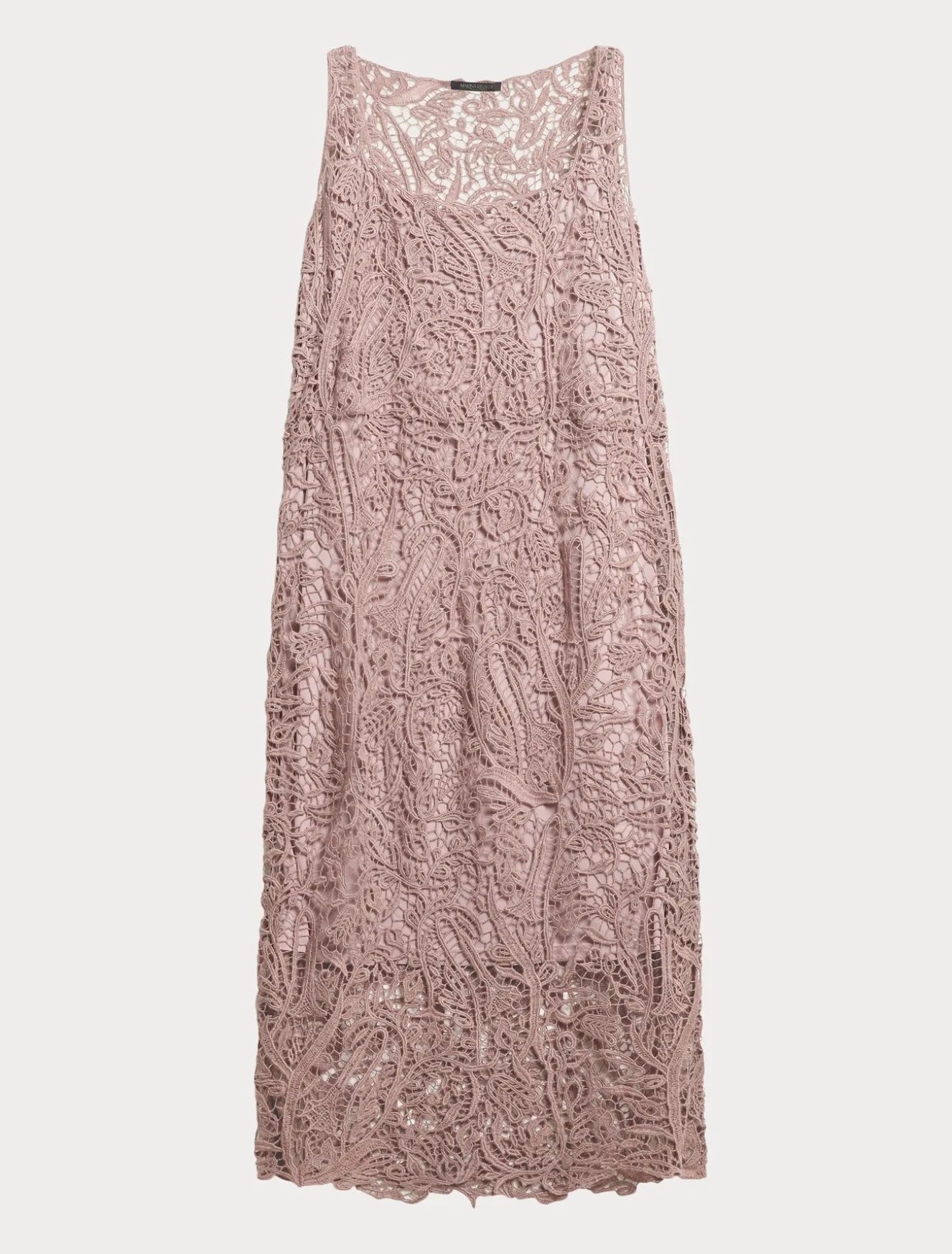 Lavorazione tessuto macramè con disegno esclusivo per l’abito di linea semiaderente con ricamo effetto macramè. Collo e giromaniche sono stati tessuti seguendo il design del modello. Perfetta per sfoggiare uno stile che non passerà inosservato, anche in abbinamento al cardigan in coordinato.Il capo fa parte della main collection Marina Rinaldi.