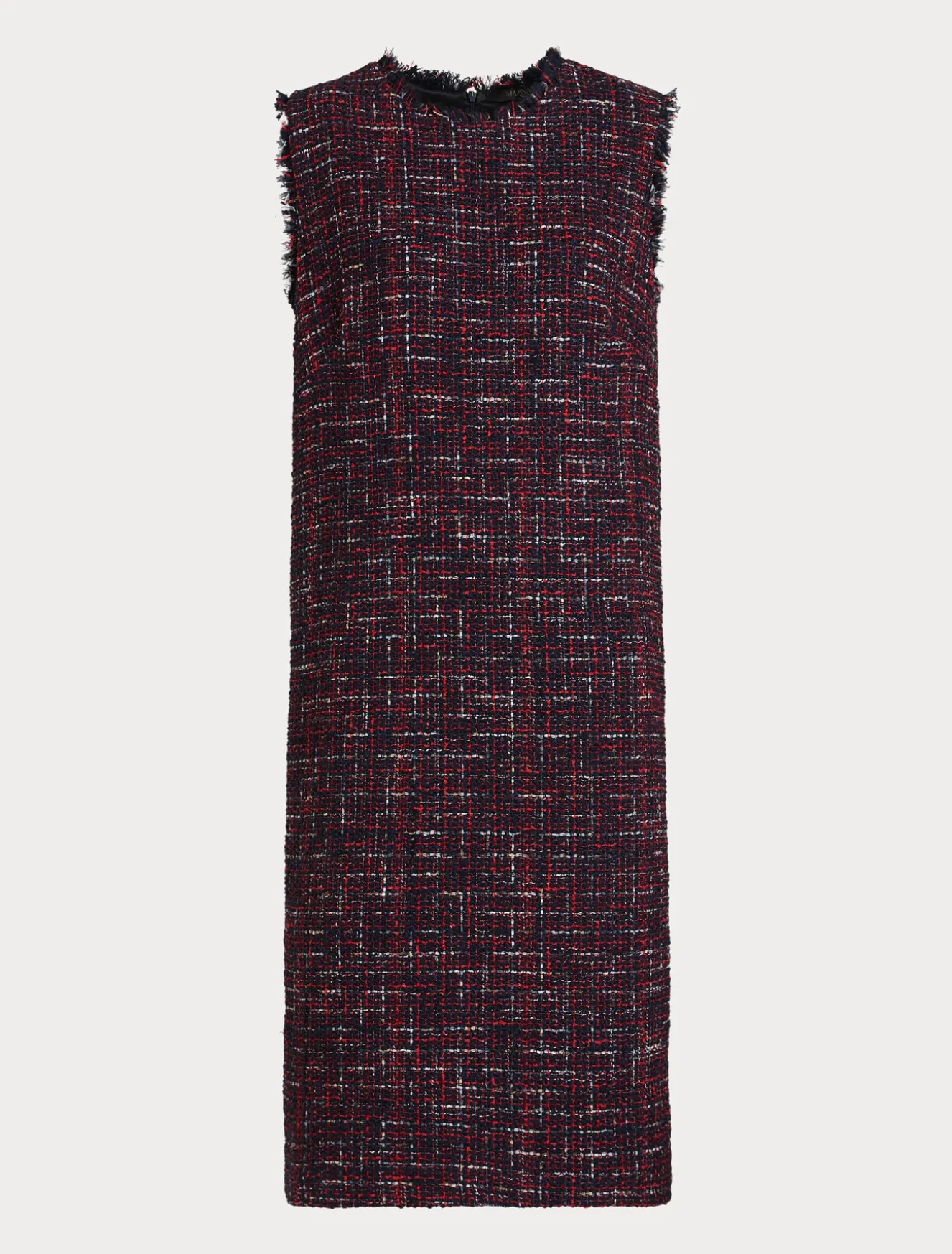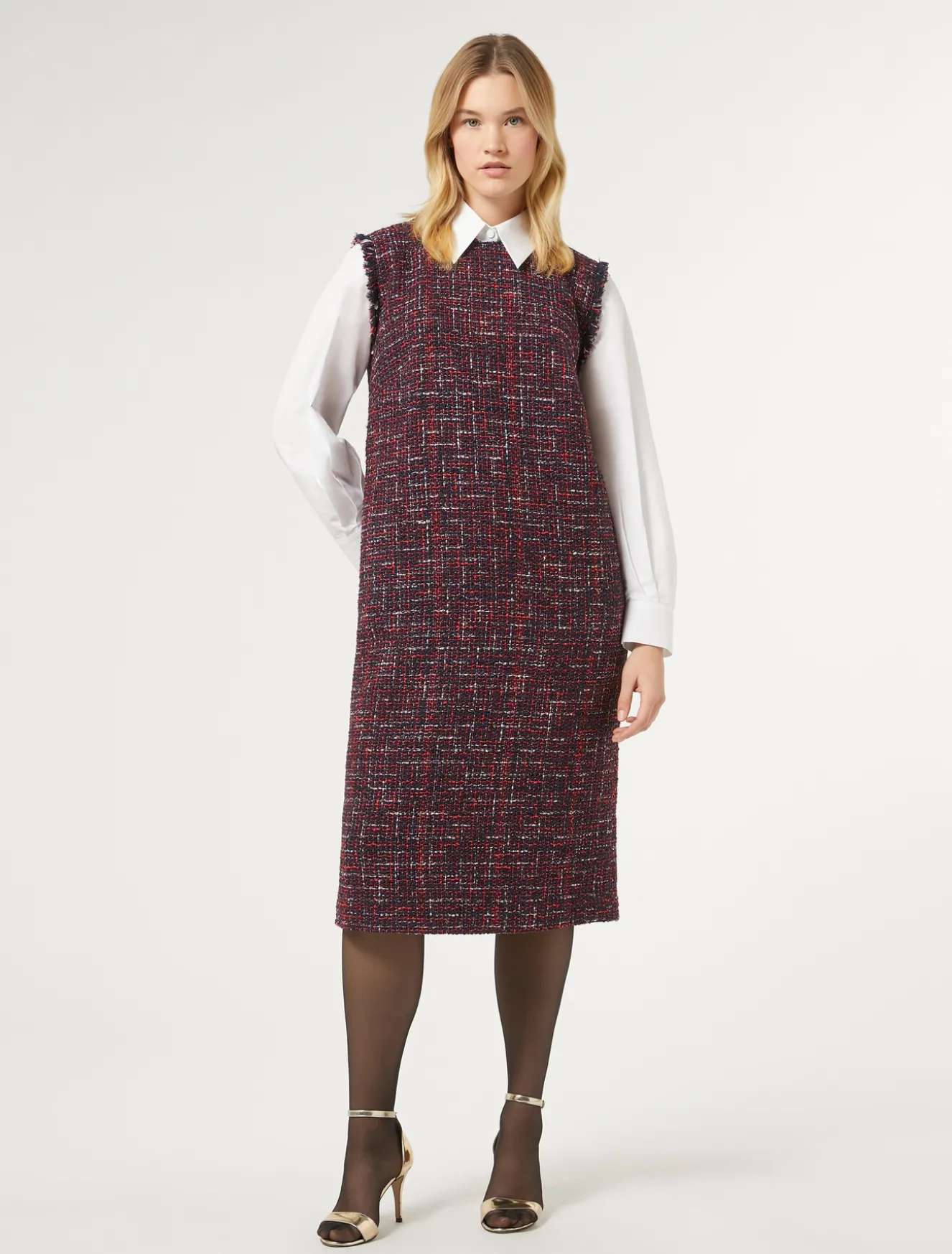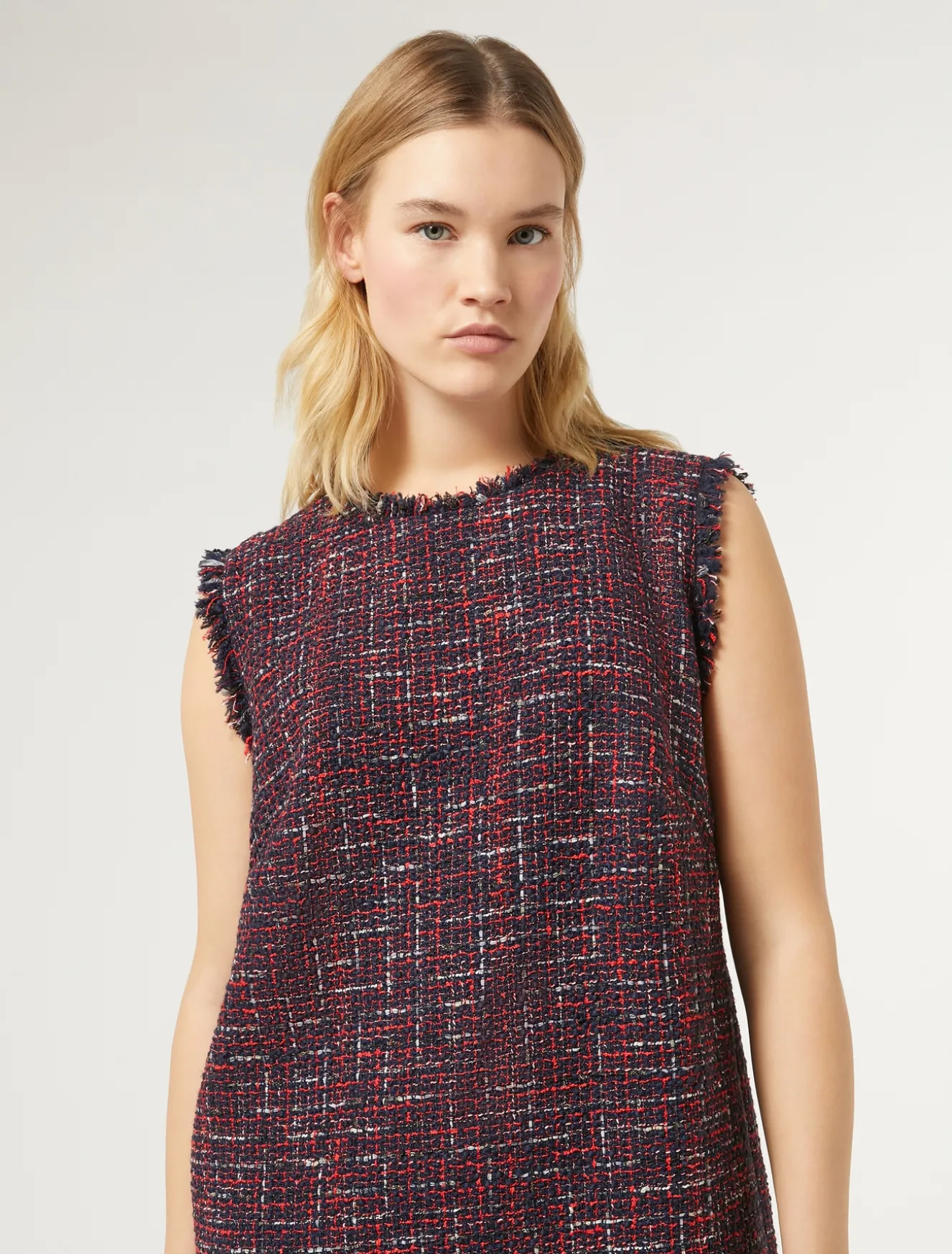 L’abito in tessuto ammagliato tinto filo effetto bouclé è rifinito da profili sfrangiati al collo e al giromanica. Viene consegnato con maniche a tre quarti sfrangiate che possono essere applicate con un intervento di sartoria. Indossalo per un’occasione speciale insieme alla giacca in coordinato.Il capo fa parte della main collection Marina Rinaldi.
