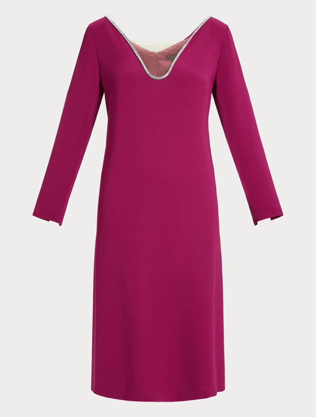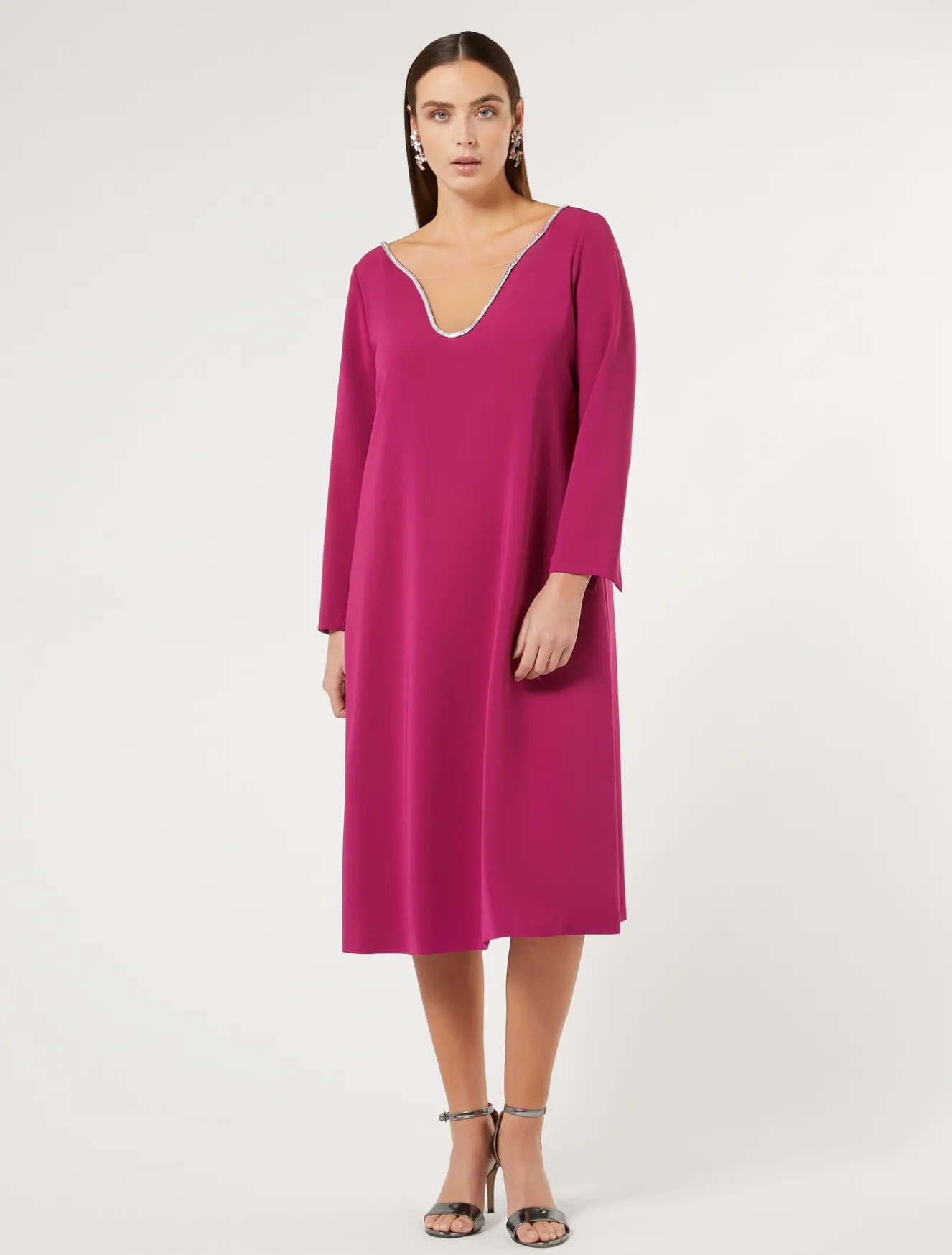 È impreziosito da una passamaneria con catena di baguette applicata a mano l’abito in cady triacetato, un tessuto fluido, di facile manutenzione e anti-imperfezioni. Ampio scollo sagomato davanti e dietro con inserto in tulle davanti.Il capo fa parte della collezione Elegante.