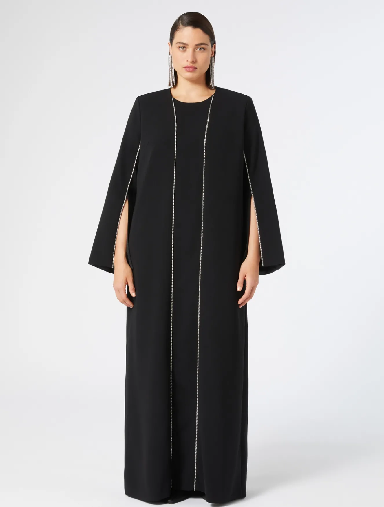 L’abito in cady triacetato è impreziosito da passamanerie gioiello che definiscono i tagli verticali e le maniche, per un effetto soprabito.