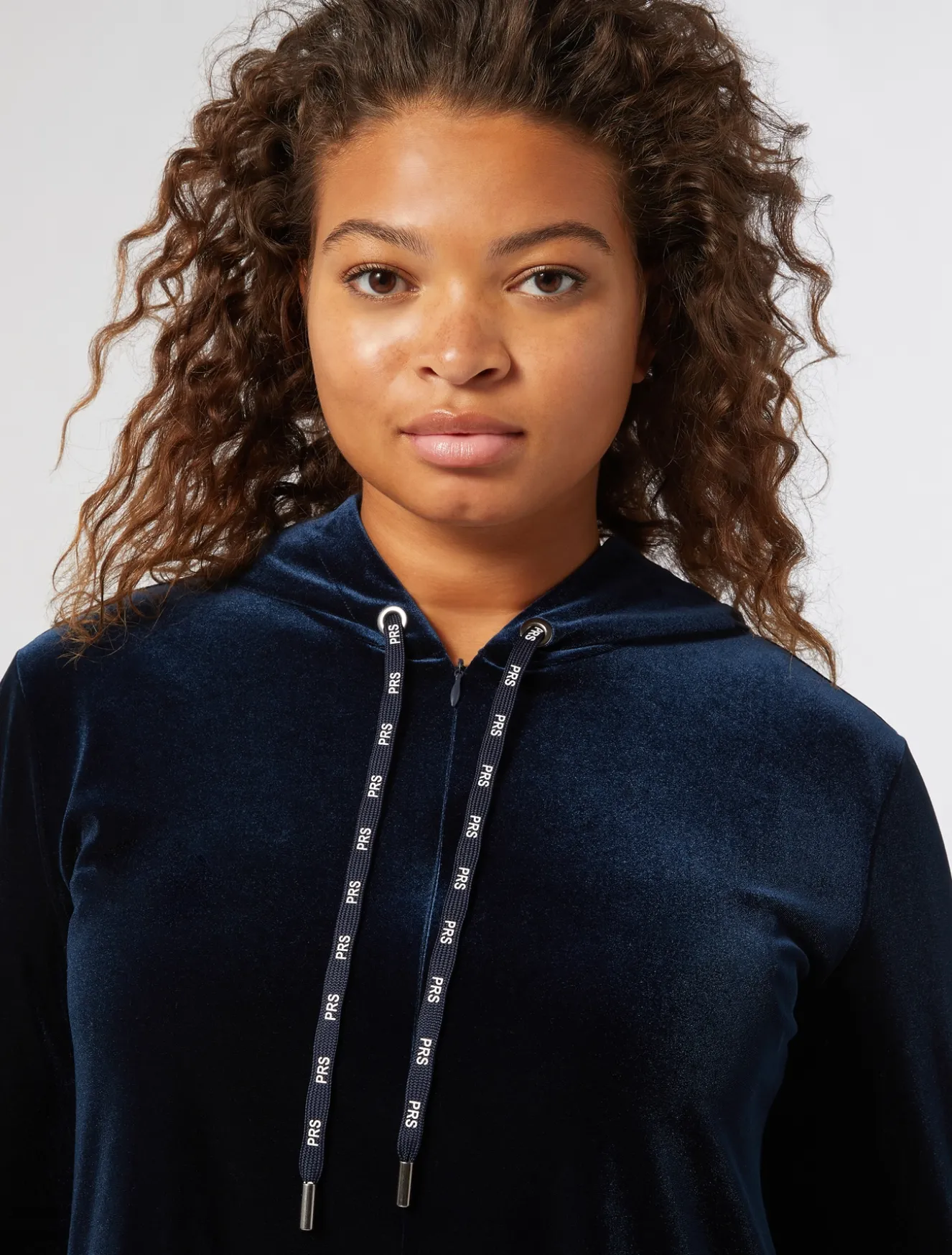 Attitudine sporty-chic per l’abito in ciniglia stretch con cappuccio e coulisse personalizzata, maniche lunghe, tasche inserite nei fianchi. Il capo fa parte della collezione Persona by Marina Rinaldi.