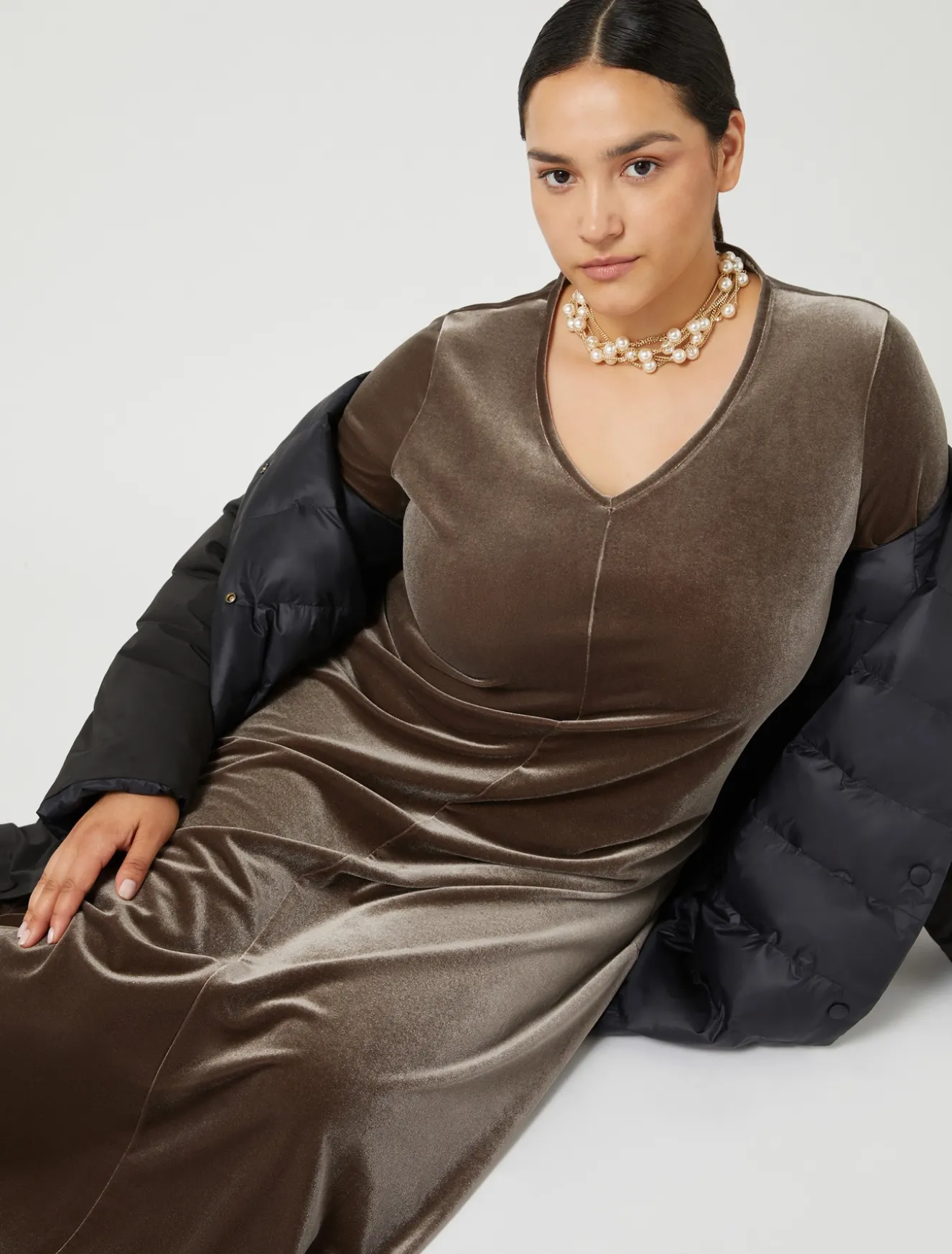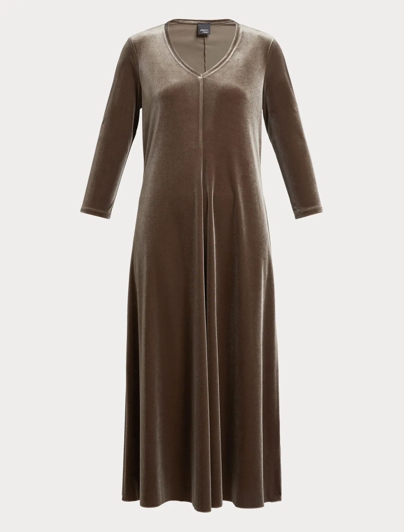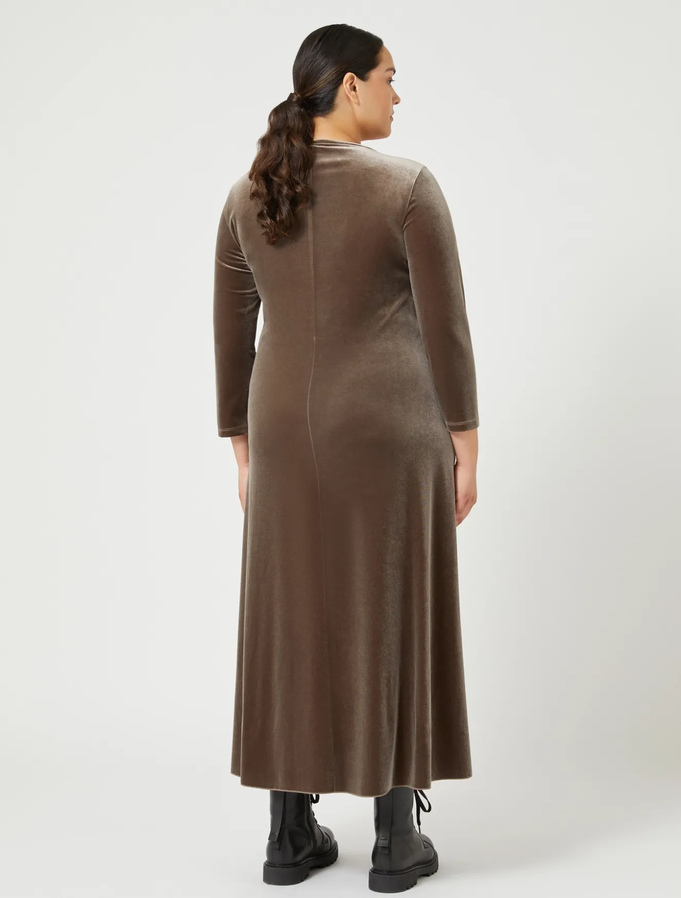 Volumi protagonisti per l’abito in ciniglia stretch con scollo a V, maniche a tre quarti e linea svasata.Il capo fa parte della collezione Persona by Marina Rinaldi.