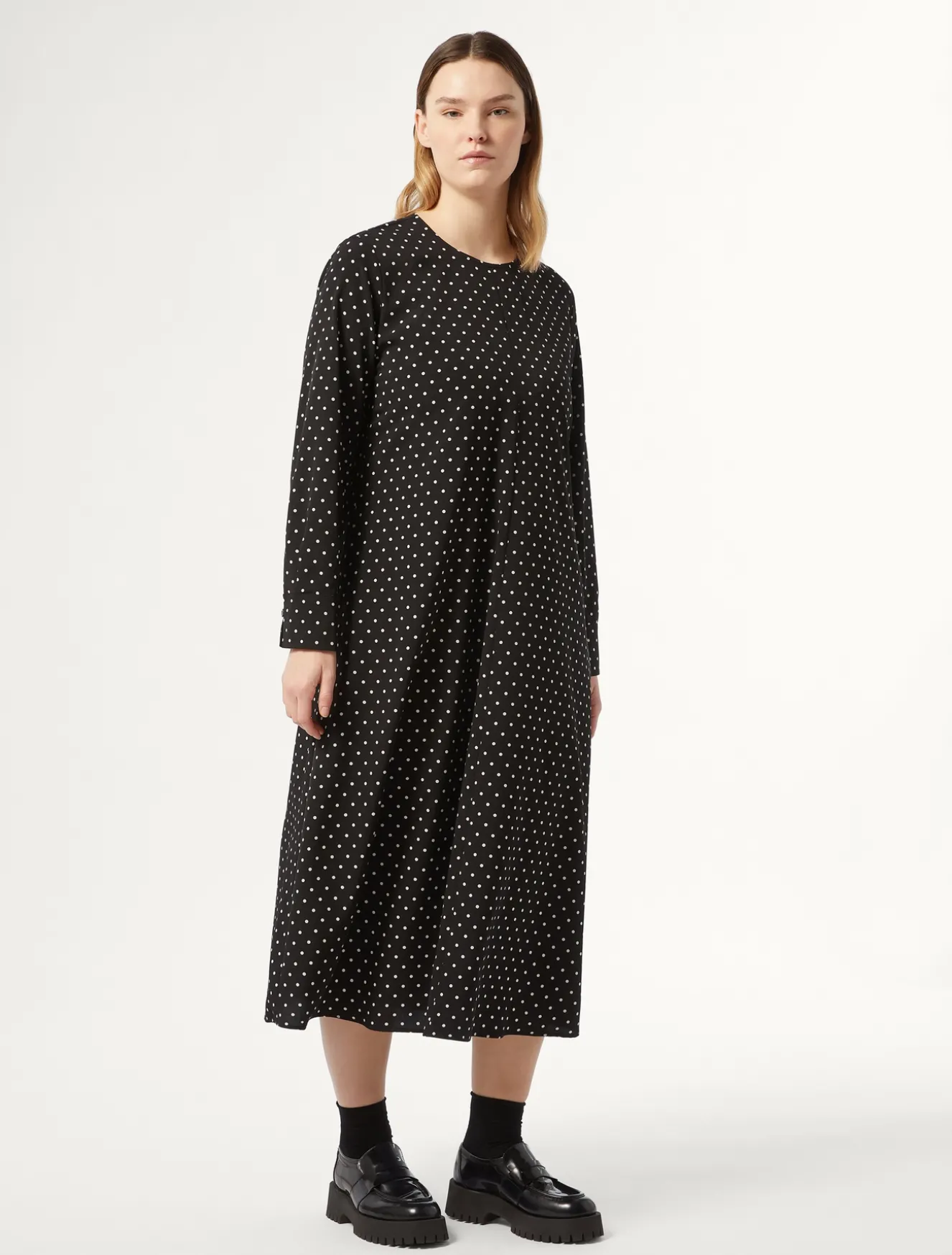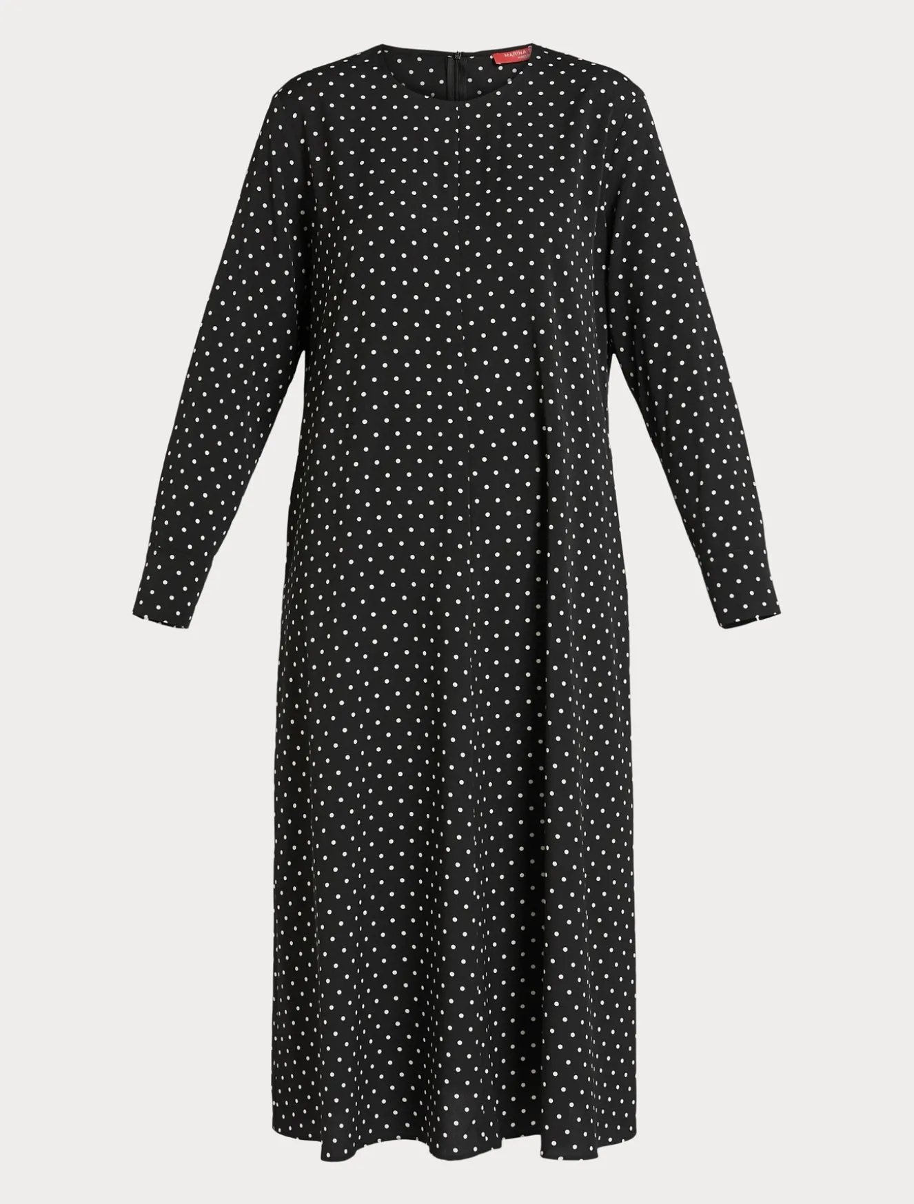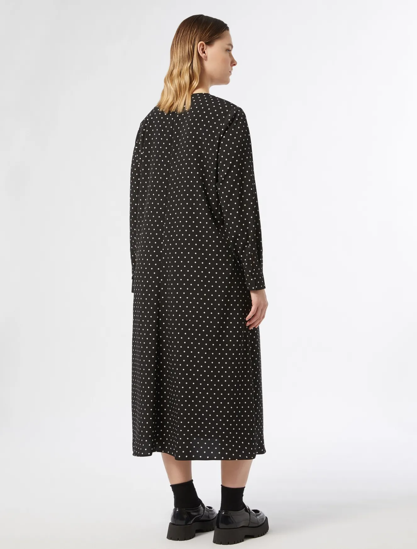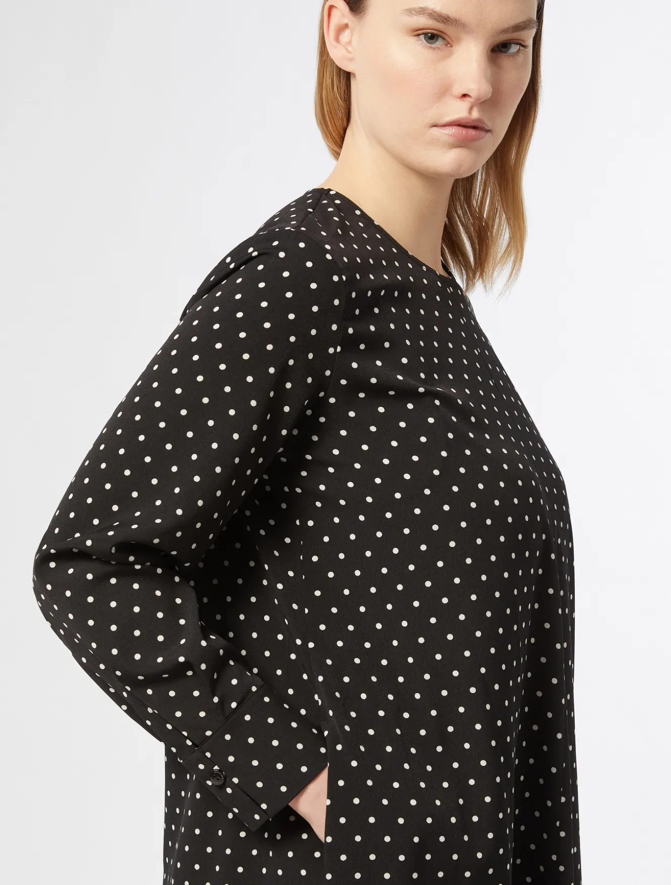Lo puoi indossare con o senza la fusciacca abbinata l’abito in crêpe de Chine con stampa a pois. Per dare una nota grafica allo stile quotidiano.Il capo fa parte della collezione Marina Sport.