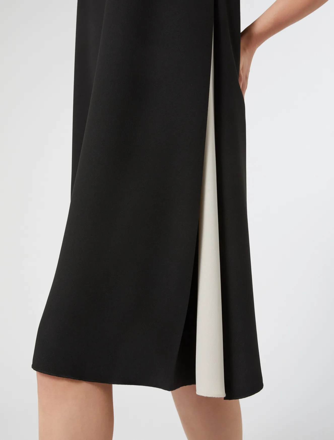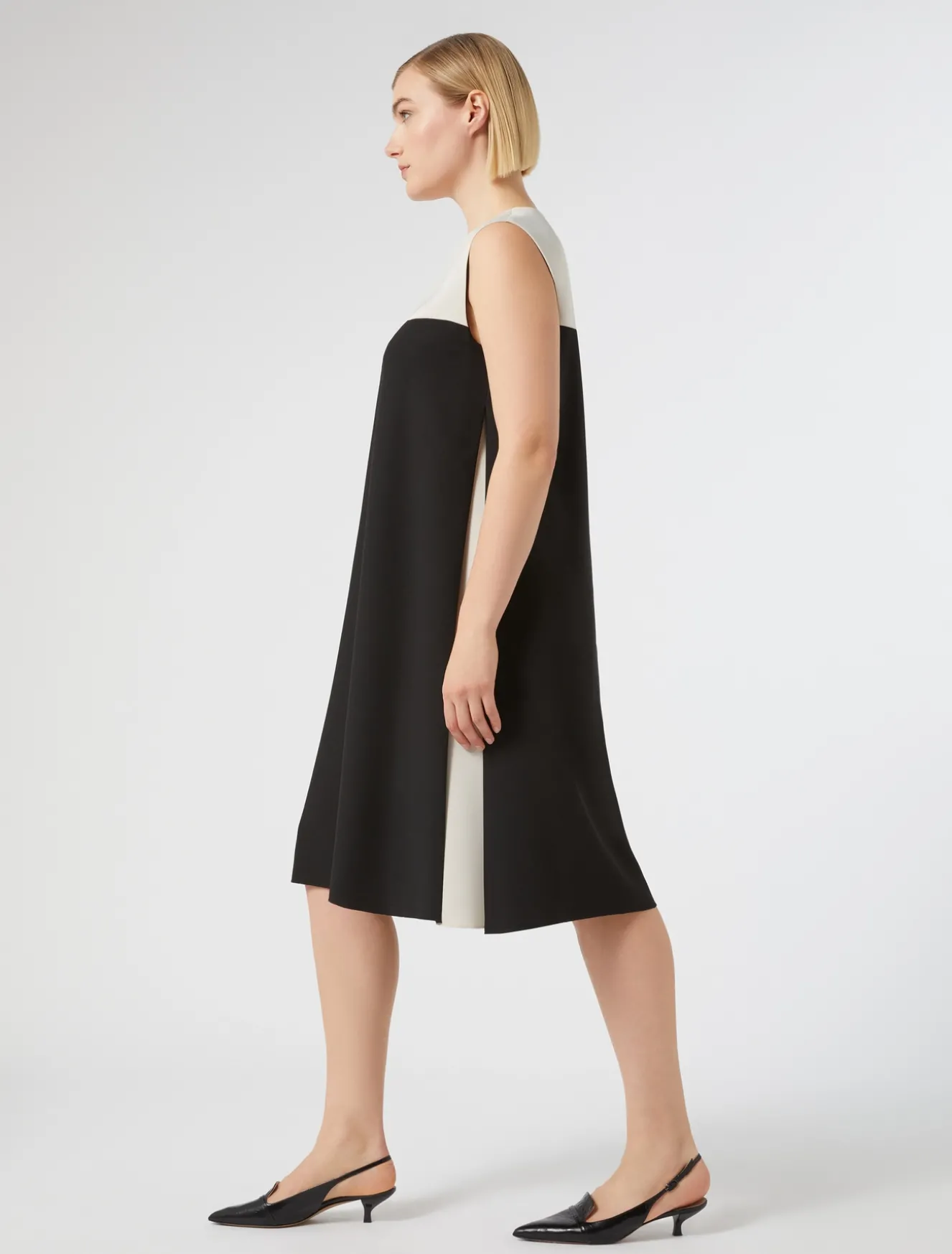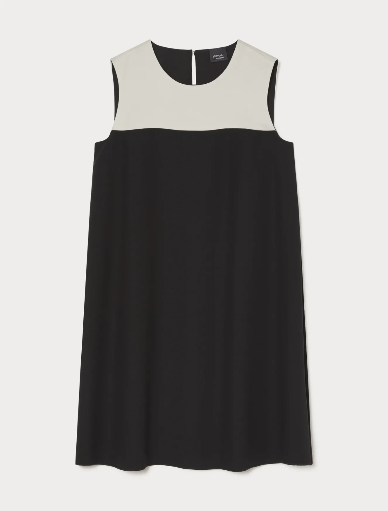 Giochi di lucido e opaco per l’abito A-line in crêpe envers satin, con carré e fianchi in tessuto lucido. Puoi applicare le maniche corte in dotazione con un semplice intervento di sartoria dedicato.