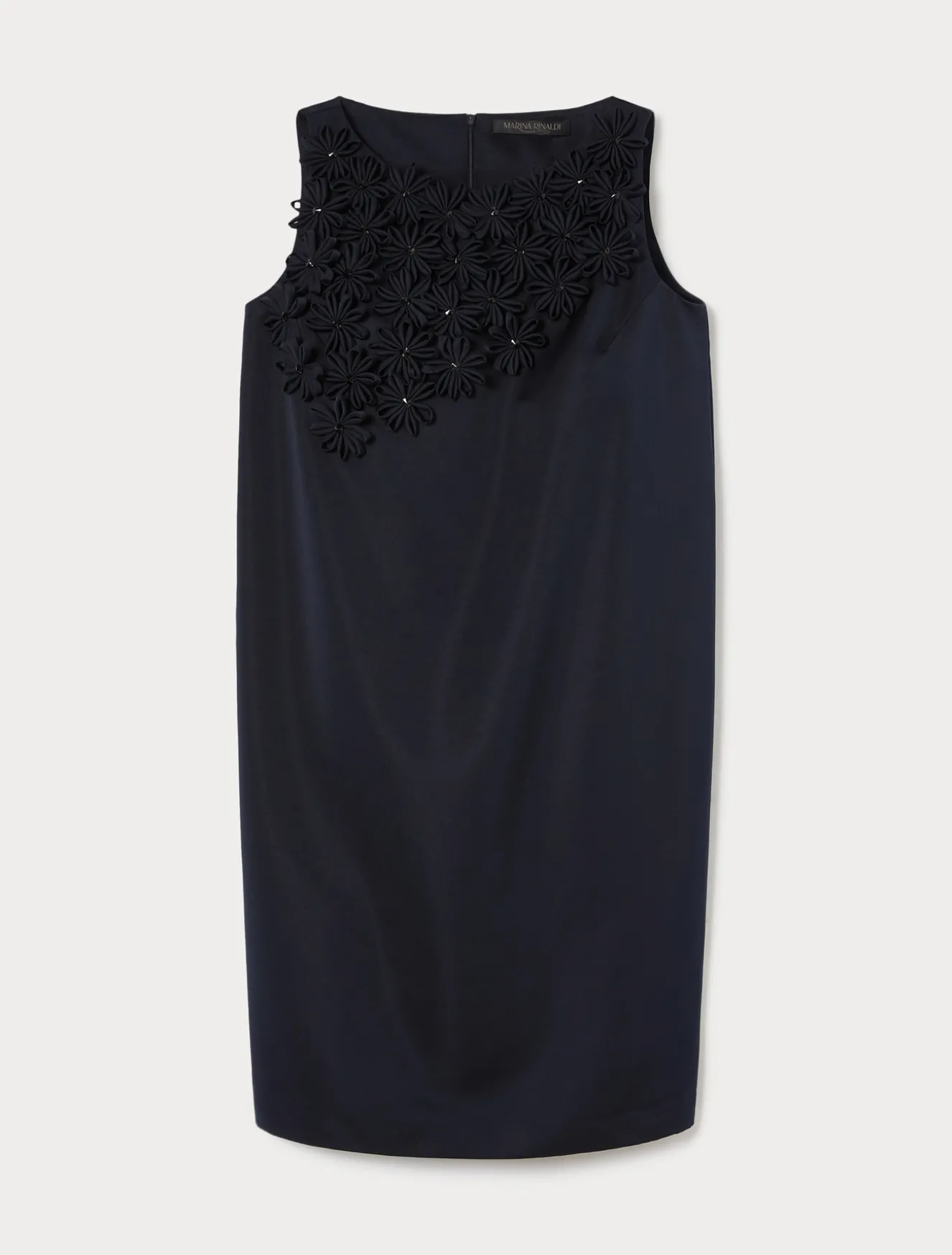 È impreziosito da applicazioni a mano di fiori in tessuto e jais al carré l’abito in duchesse, dalla linea boxy. Puoi applicare le maniche a tre quarti con un intervento di sartoria dedicato.