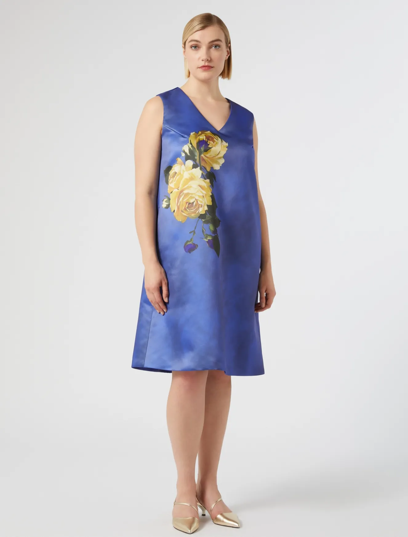 Stampa piazzata a fiore per l’abito in duchesse, dalla linea ad A. Puoi applicare le maniche corte in dotazione con un semplice intervento di sartoria dedicato.