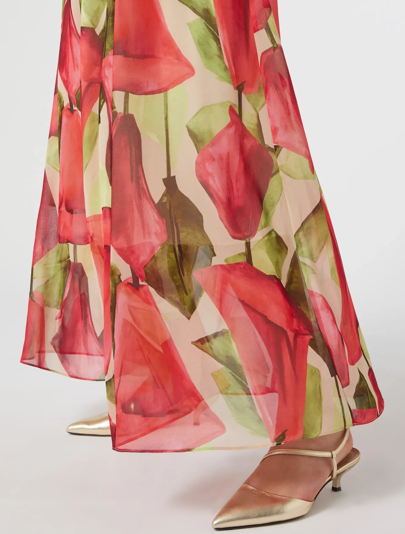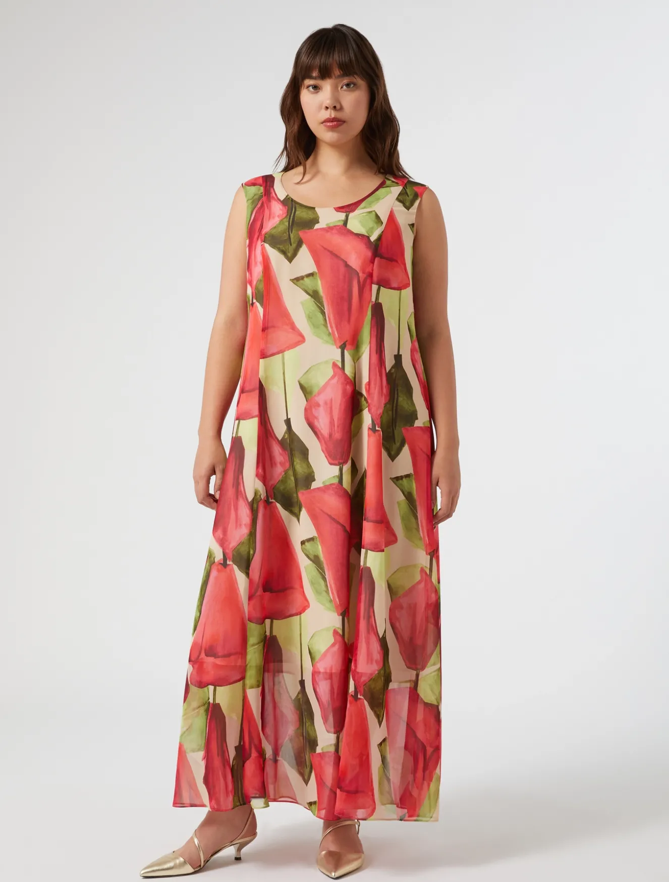 Stampa in esclusiva per l’abito in georgette, dalla linea scivolata. Puoi applicare le maniche corte in dotazione con un semplice intervento di sartoria dedicato.