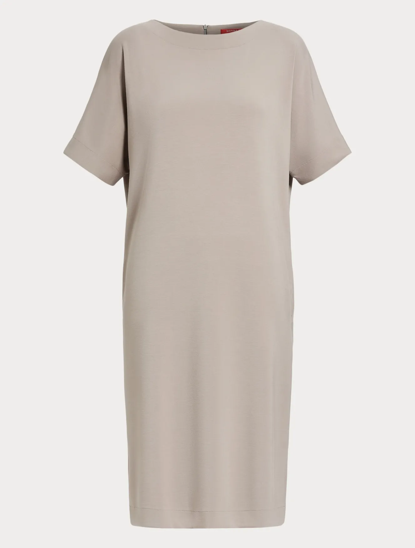 Linea cozy a uovo per l’abito in jersey double di misto viscosa, dalla mano morbida, con maniche a kimono. Pratico ed essenziale per tutti i giorni.Il capo fa parte della collezione Marina Sport.