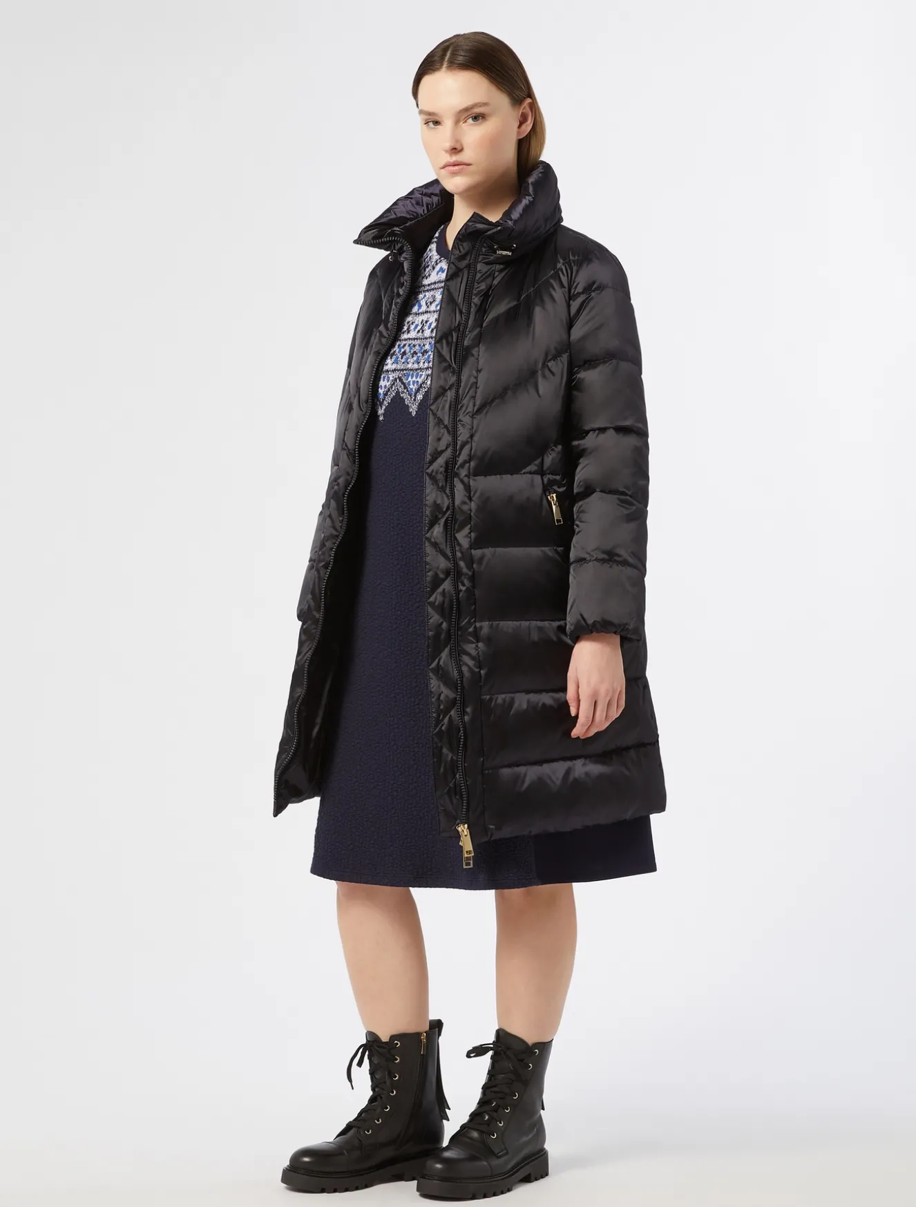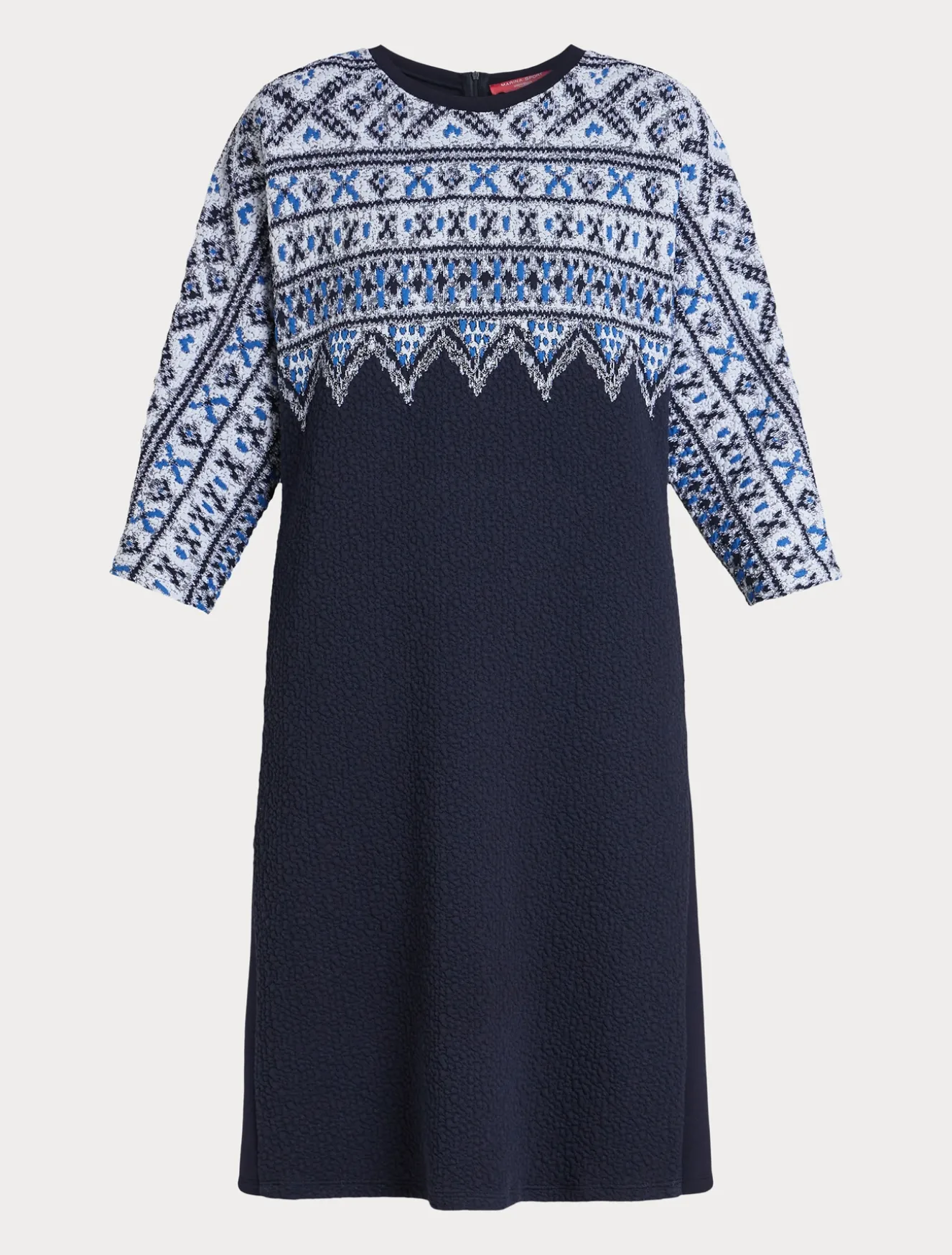 Lavorazione esclusiva per l’abito in jersey scuba di misto viscosa stretch con inserto davanti in jersey matelassé con disegni d’ispirazione nordica piazzati. Perfetto per essere subito pronta.Il capo fa parte della collezione Marina Sport.