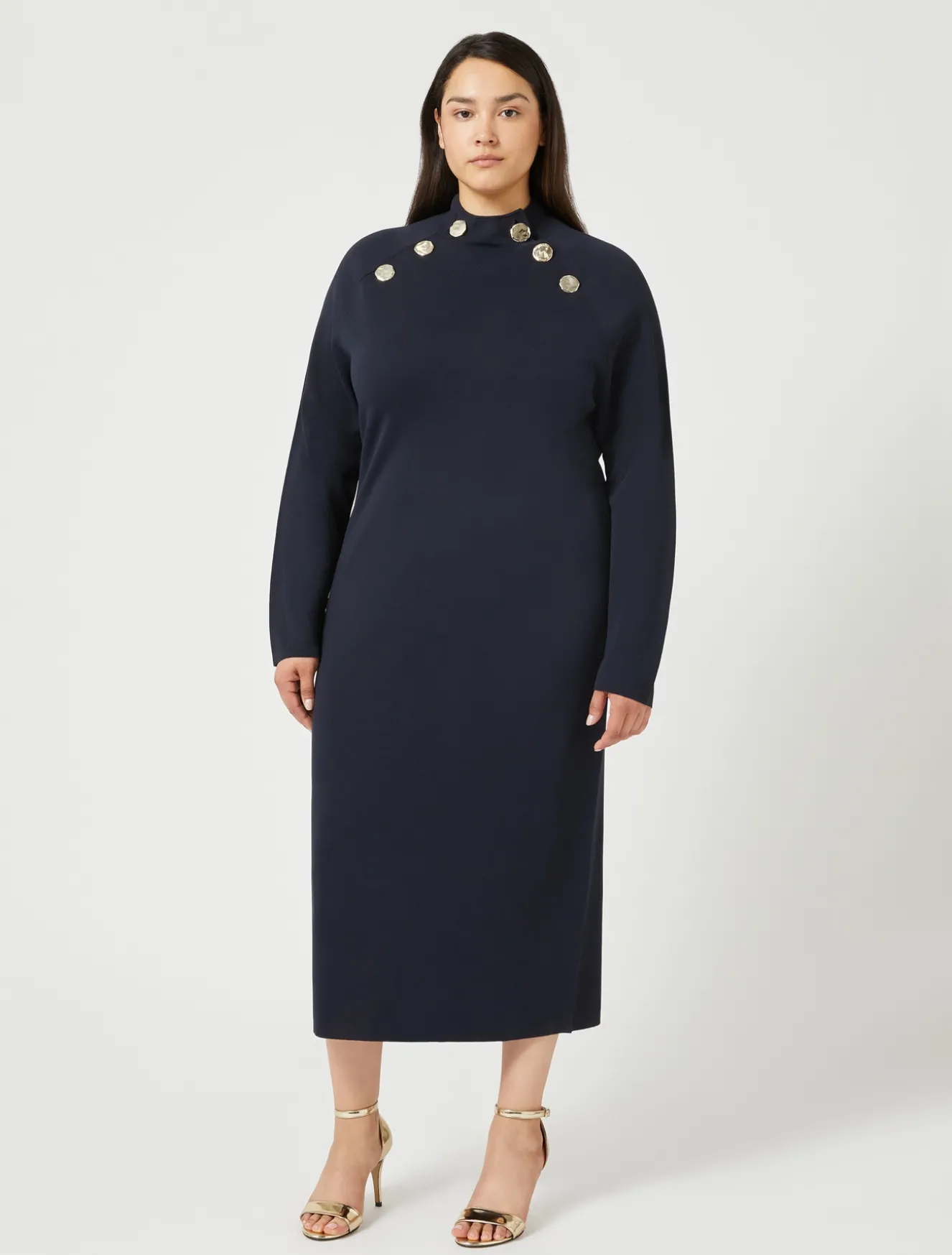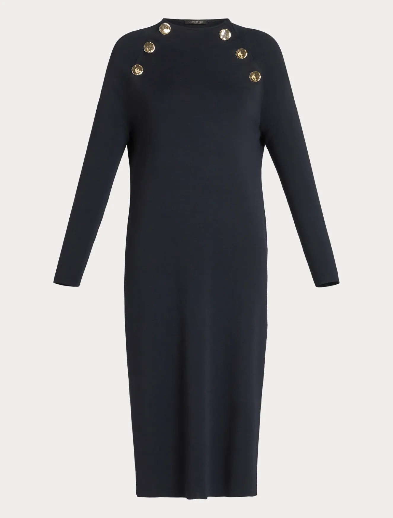 L’abito femminile in maglia è costruito con linea semiaderente e bottoni in metallo color oro. Un modello passe-partout da indossare tutti i giorni e nelle occasioni speciali.Il capo fa parte della main collection Marina Rinaldi.