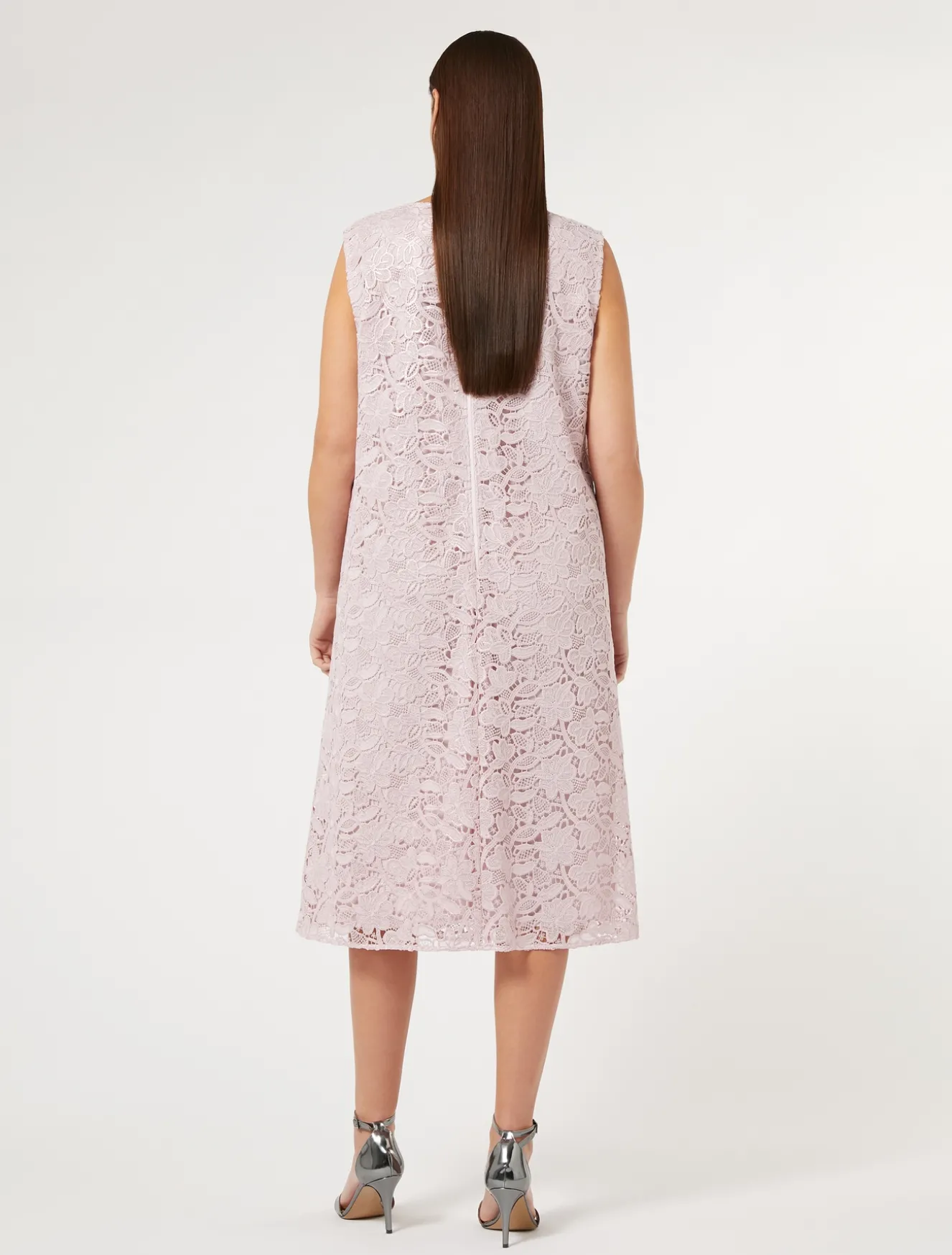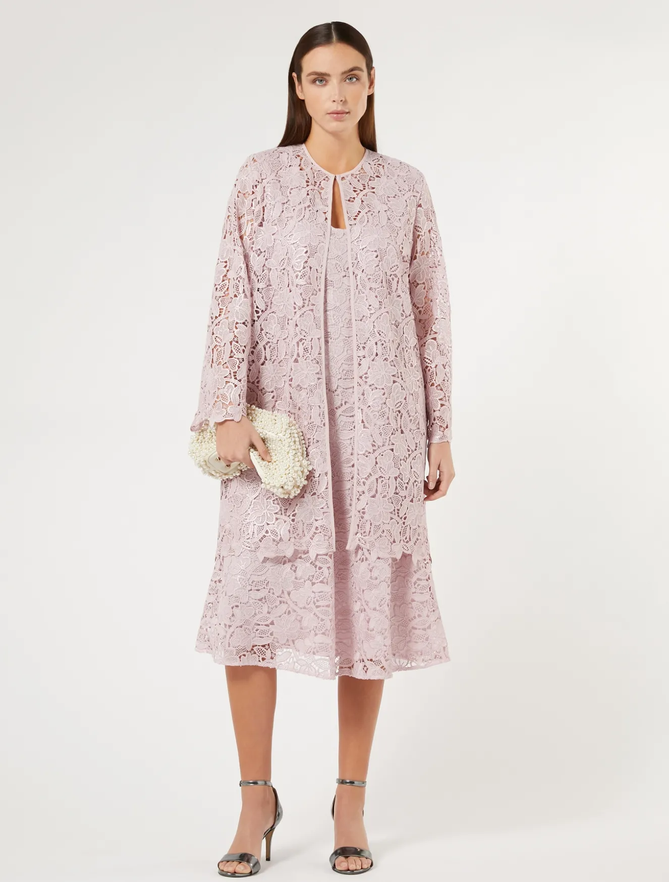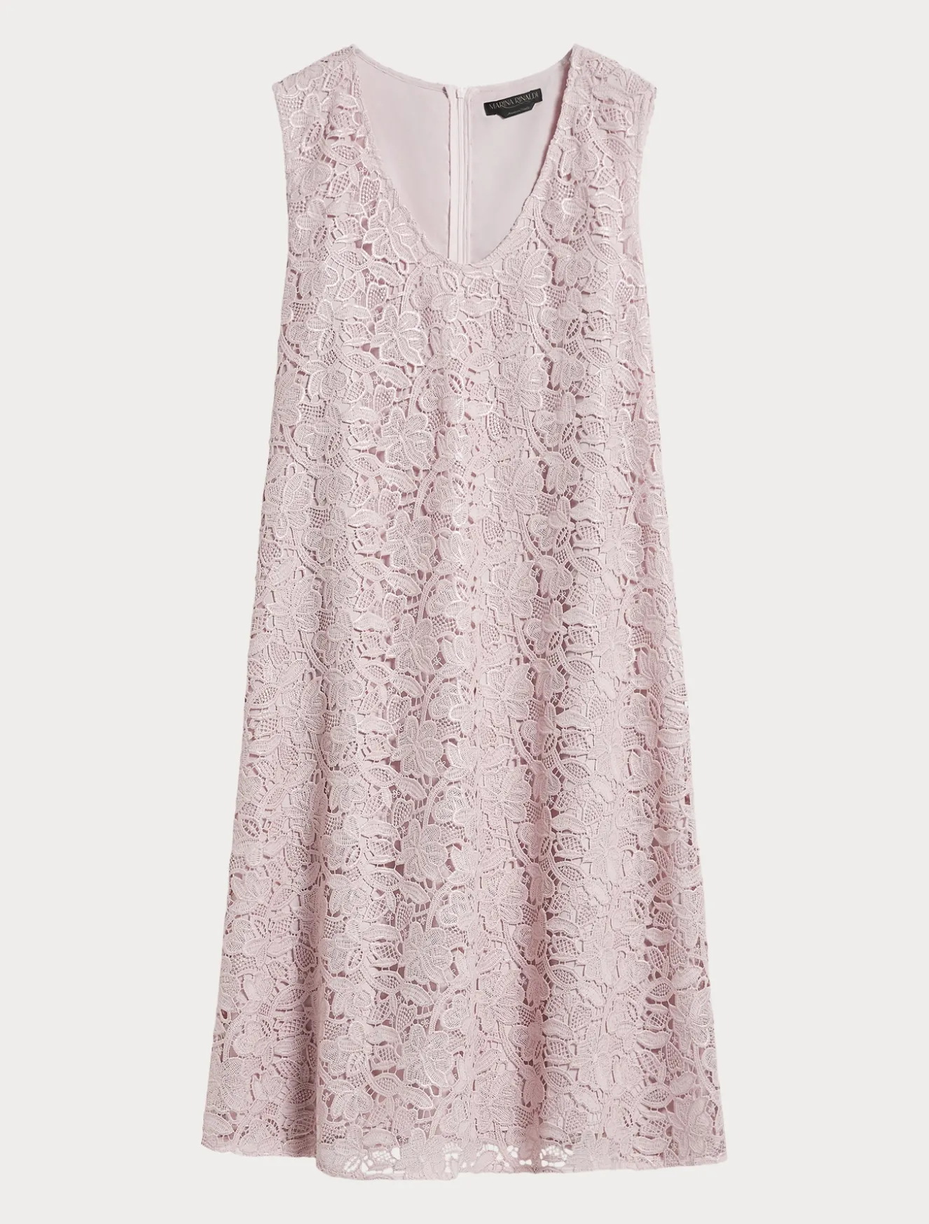 Pizzo macramè spalmato con lamina metallica tono su tono per l’abito dalla linea svasata. Puoi applicare al modello le maniche lunghe con un semplice intervento di sartoria.Il capo fa parte della collezione Elegante.