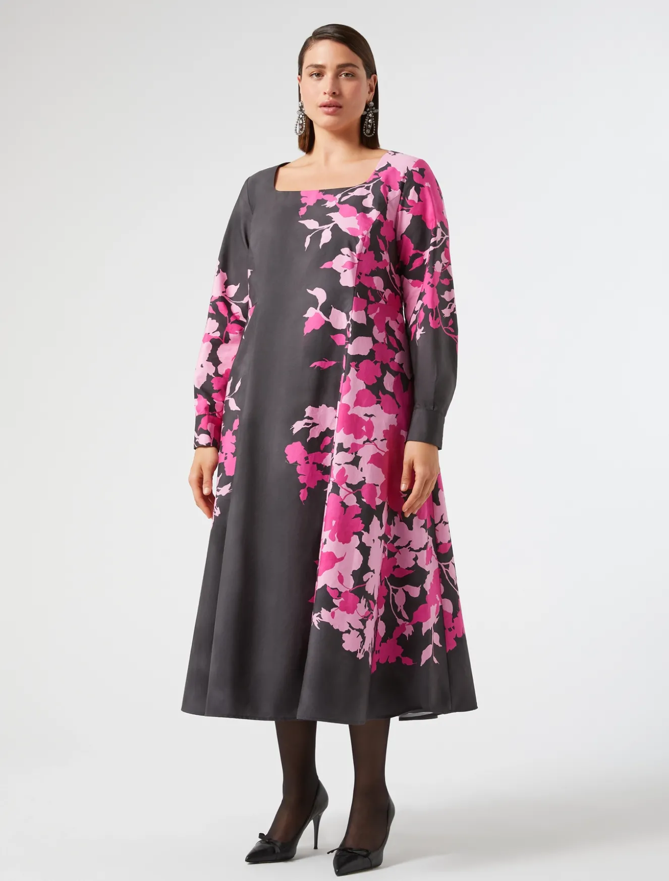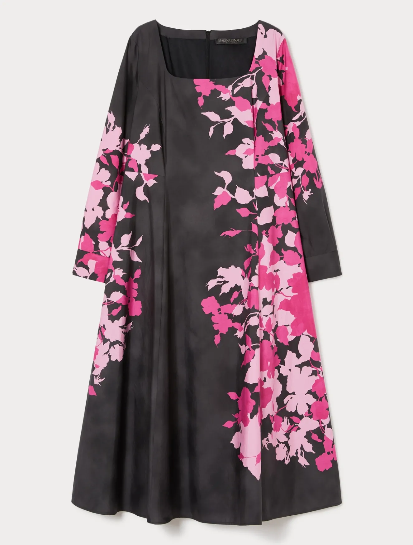 Corpino aderente e gonna svasata a teli per l’abito in popeline di puro cotone con stampa esclusiva piazzata. Un modello perfetto per un’occasione speciale.