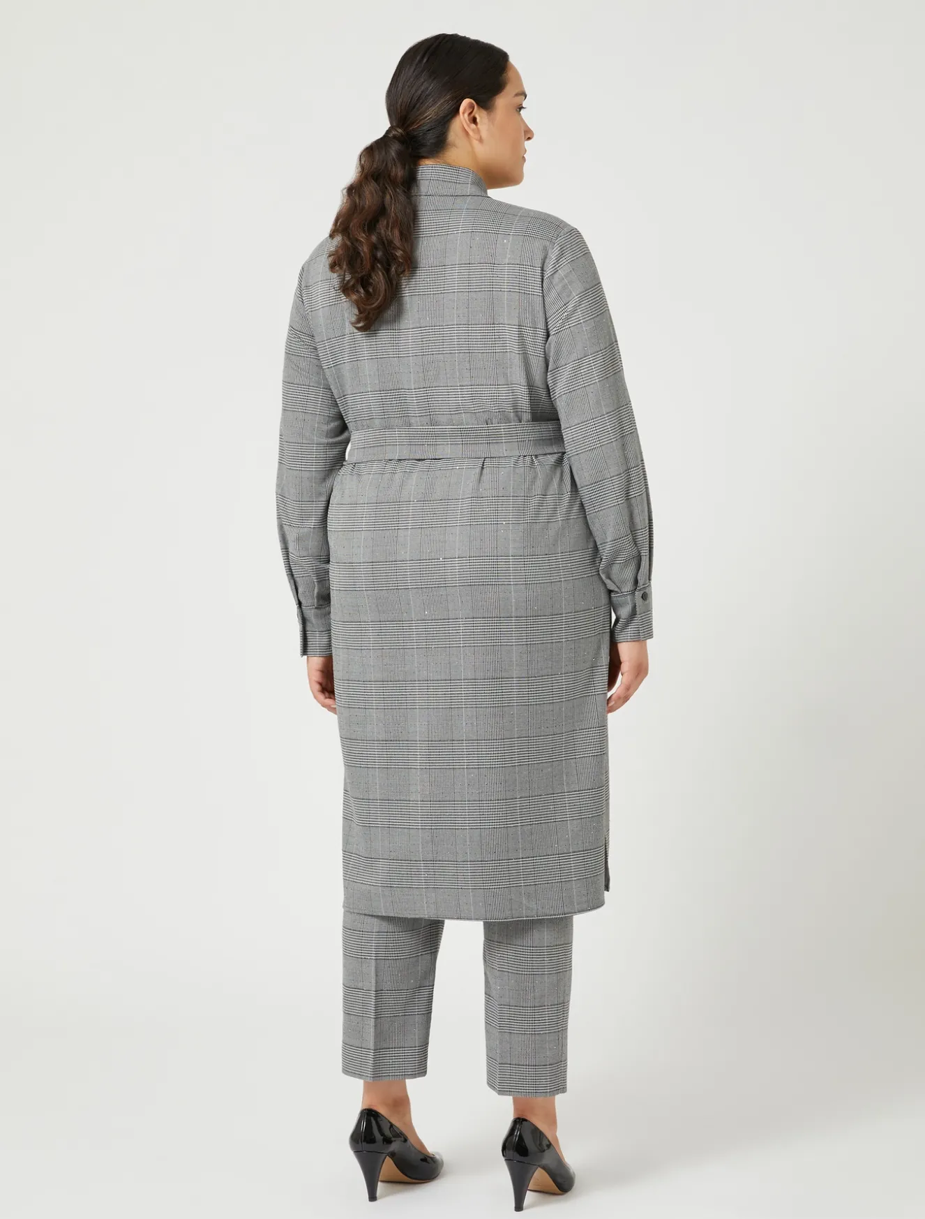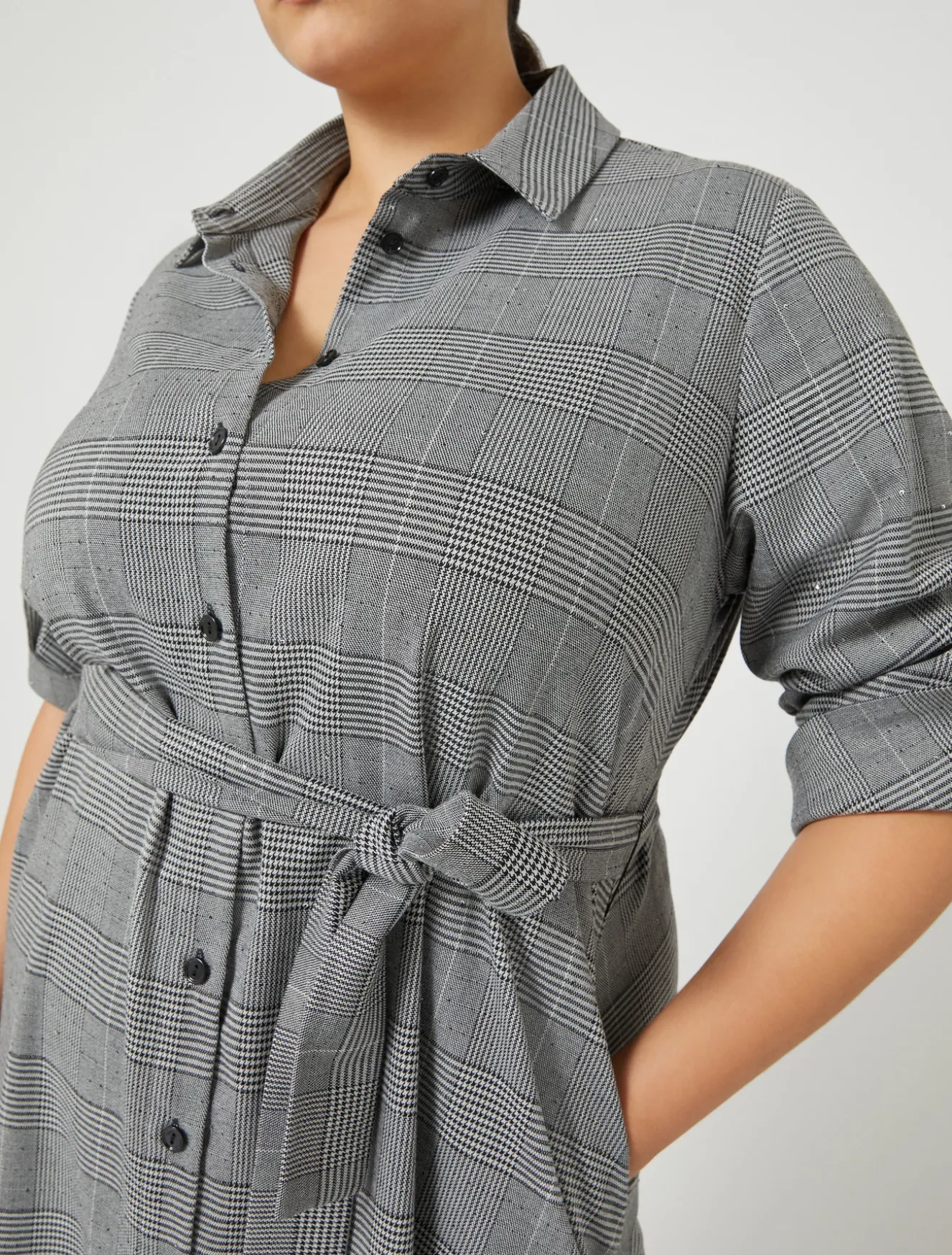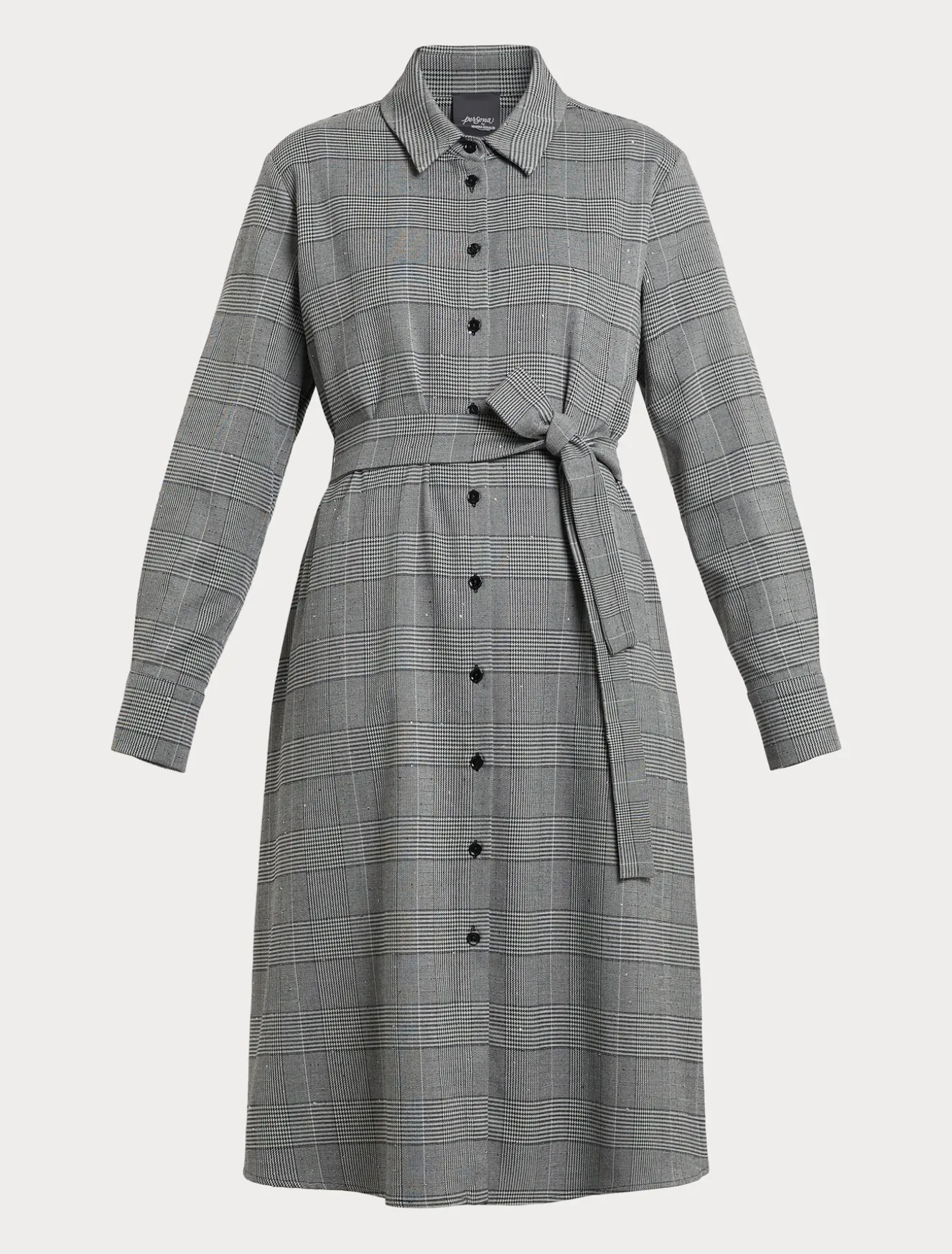 Ispirazioni daily chic per l’abito chemisier in tinto filo a disegno principe di Galles. Lo puoi regolare in vita con la cintura in coordinato.Il capo fa parte della collezione Persona by Marina Rinaldi.