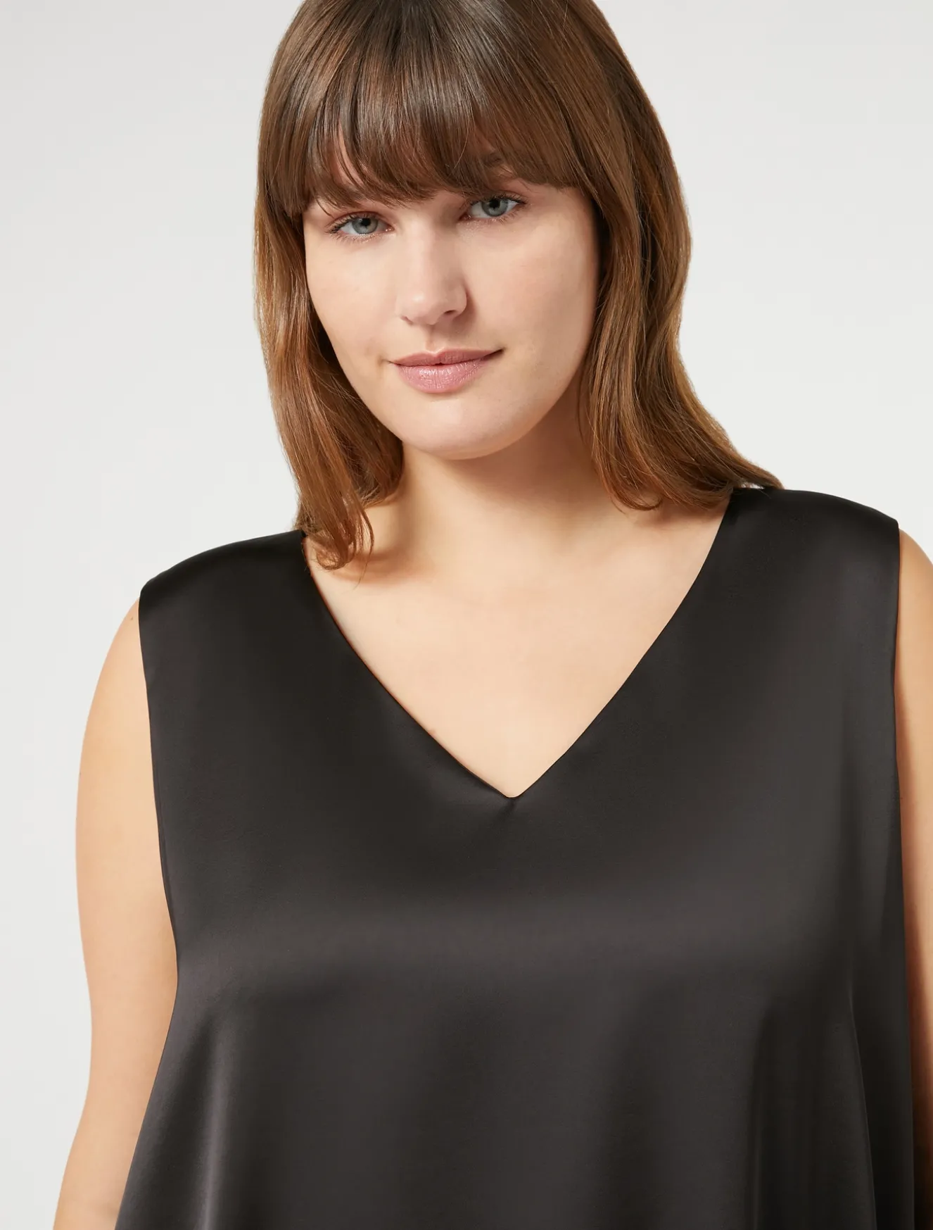 Appeal senza tempo per l’abito in raso fluido, dalla linea svasata. Un modello dall’eleganza rilassata, a cui puoi applicare le maniche con un intervento di sartoria dedicato. Il capo fa parte della main collection Marina Rinaldi.