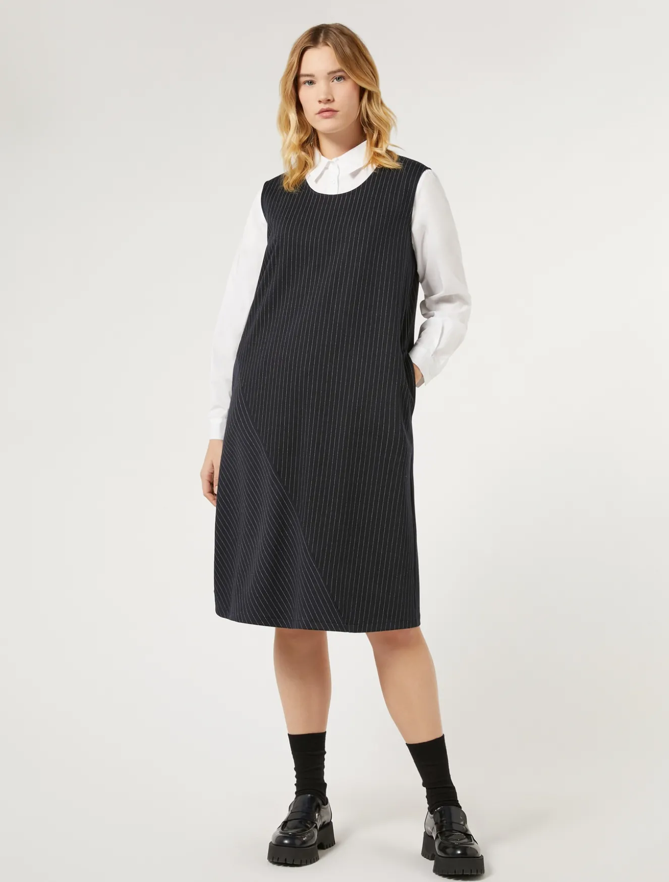 Easy da indossare, l’abito in tessuto rifinito a punto Milano ha motivi gessati con applicazione asimmetrica al fondo. Evergreen di stagione in layering con t-shirt e camicie.Il capo fa parte della collezione Persona by Marina Rinaldi.