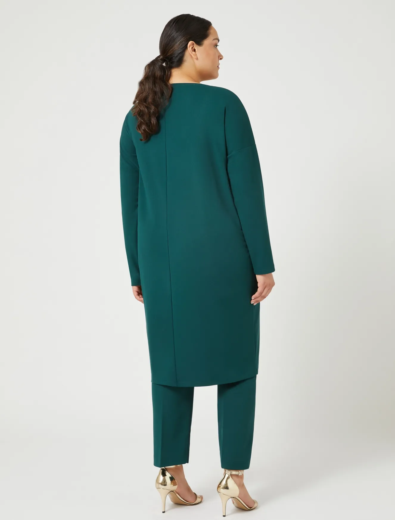 Linee fluide e femminili per l’abito in jersey tecnico con scollo leggermente a barchetta e maniche a giro basso. Il capo fa parte della collezione NOW by Marina Rinaldi.