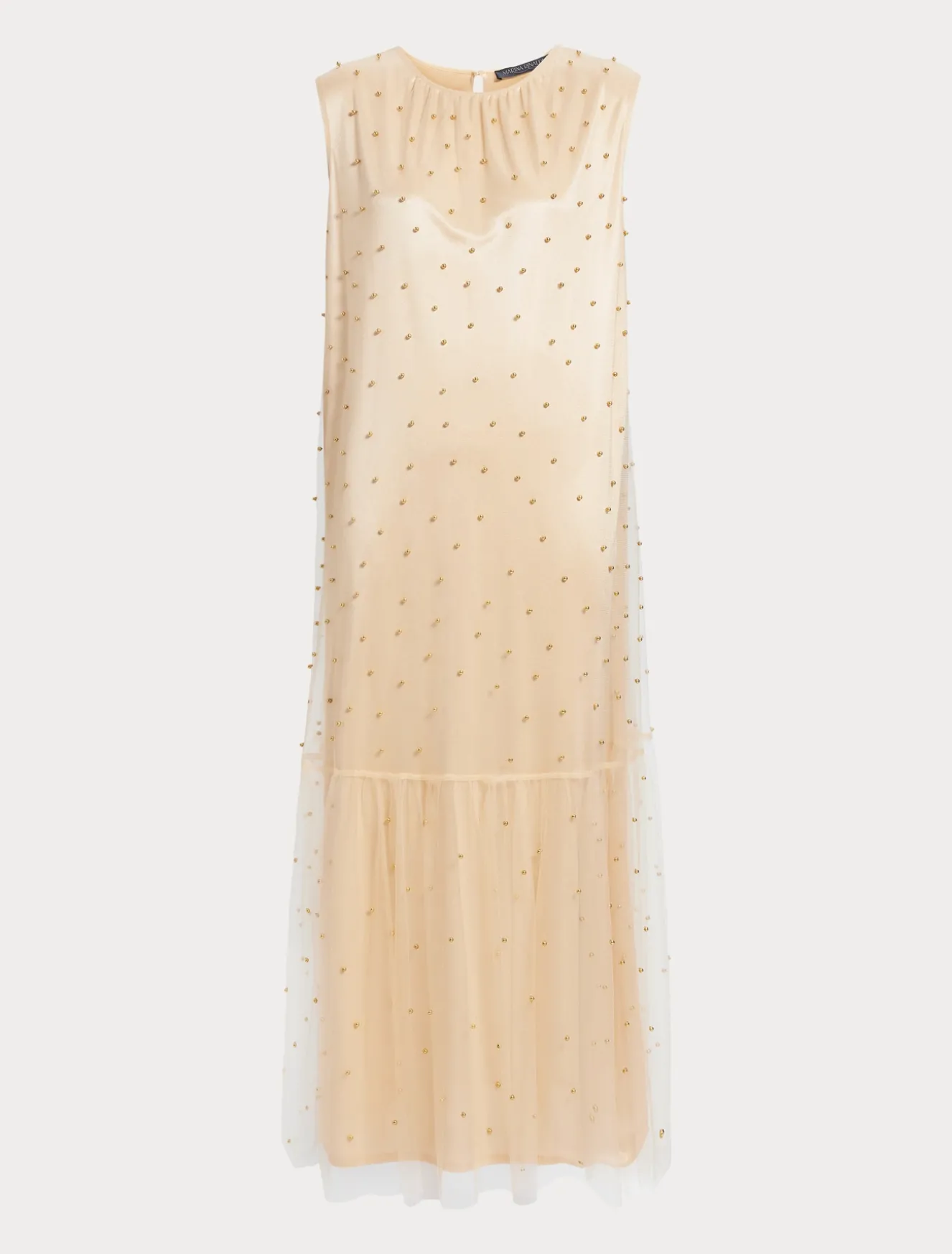 Una ricercata applicazione fatta a mano all over di perle rende unico l’abito in tulle, con balza arricciata al fondo. Un modello ricercato a cui puoi applicare le maniche lunghe in tulle liscio con un semplice intervento di sartoria. Il capo fa parte della main collection Marina Rinaldi.