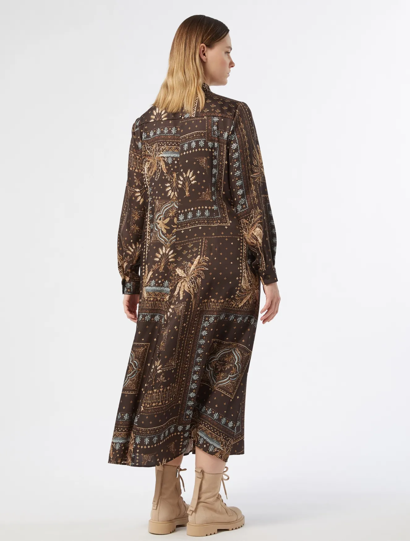 Stampa esclusiva per l’abito lungo chemisier in twill. Pinces e carré sul retro definiscono il design.Il capo fa parte della collezione Marina Sport.