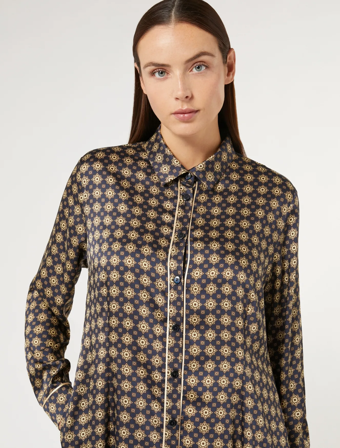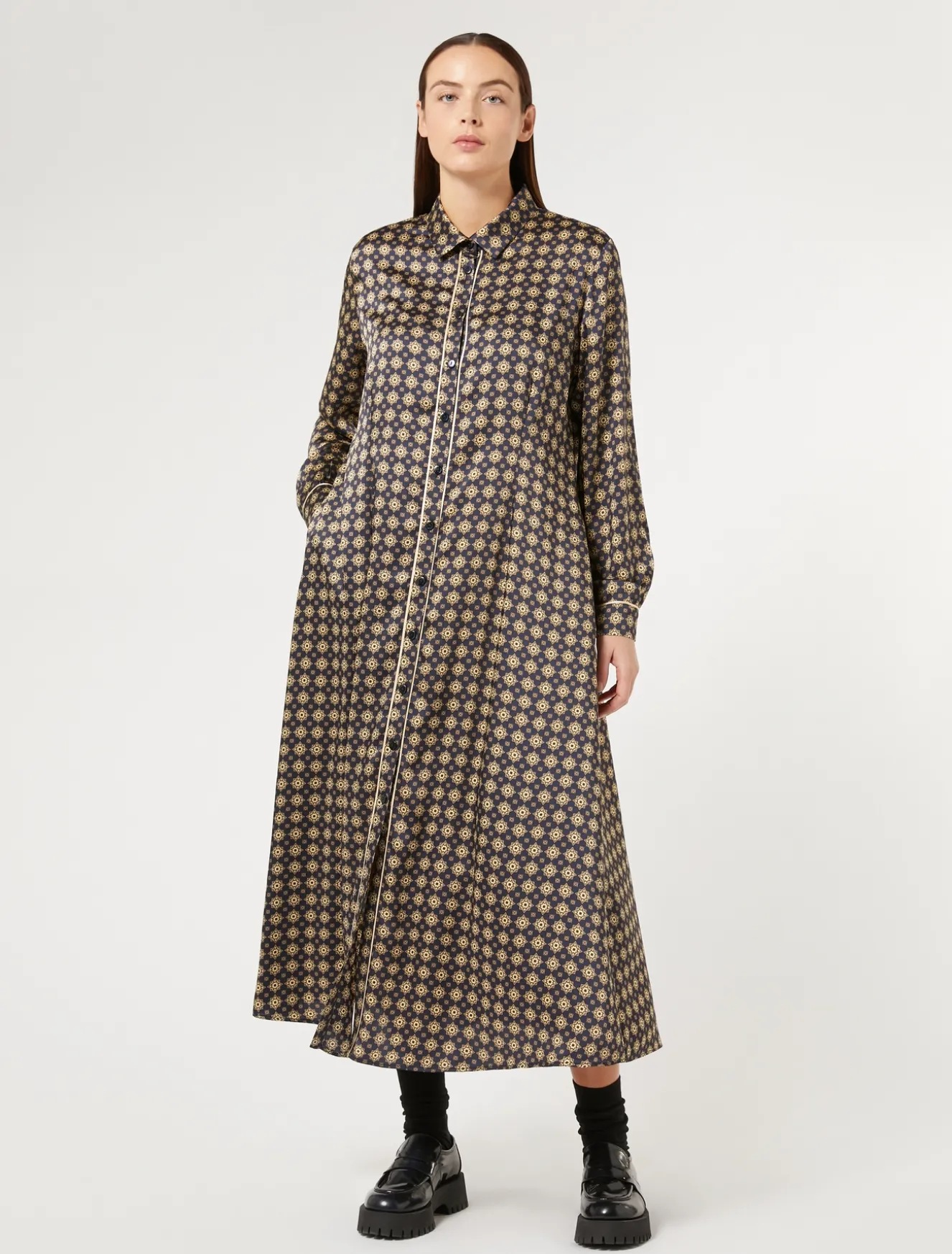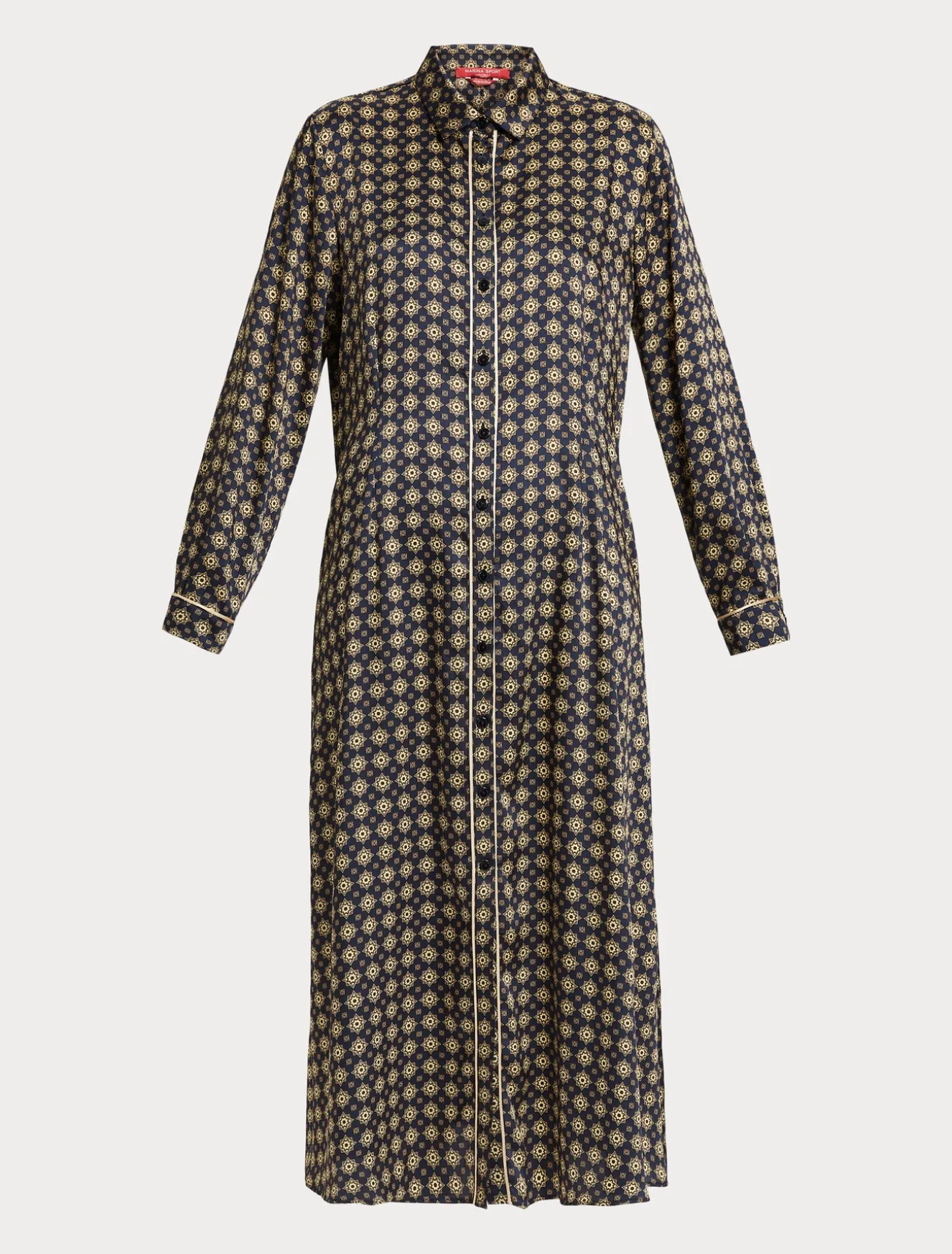 Stampa esclusiva per l’abito lungo chemisier in twill. È arricchito all’apertura e ai polsi da un dettaglio di piping a contrasto.Il capo fa parte della collezione Marina Sport.