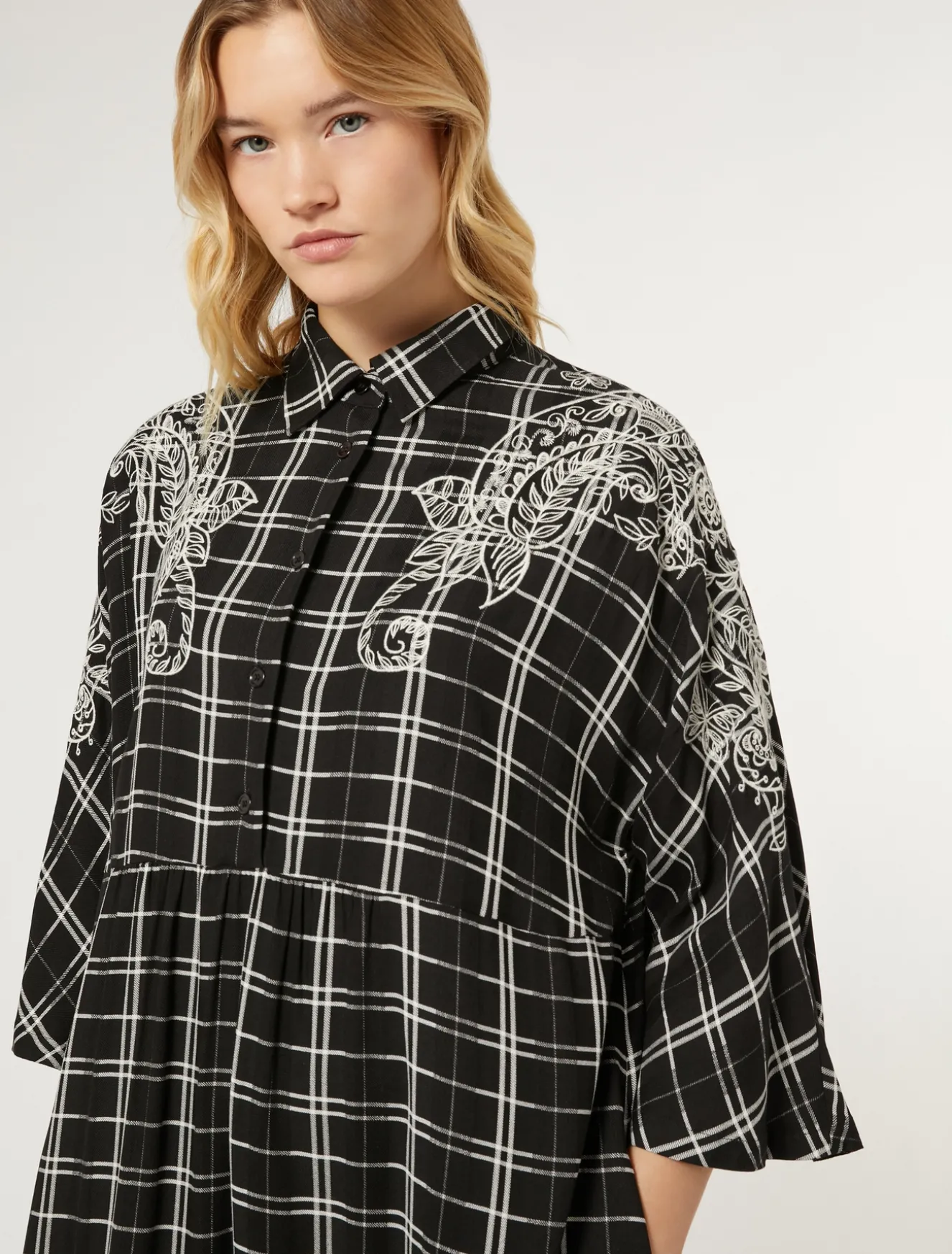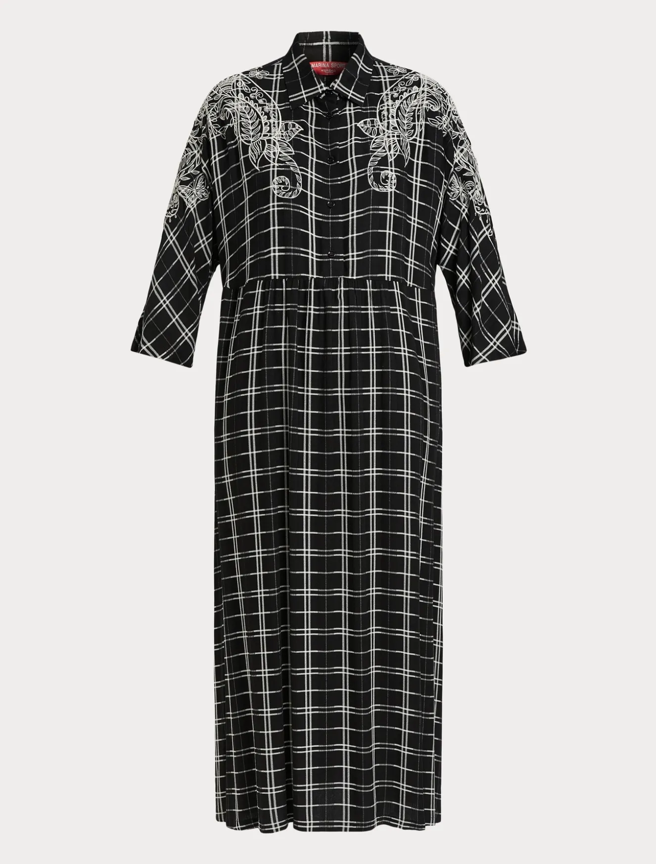 È decorato da un ricamo in filo a decoro su spalle e carré l’abito lungo in viscosa fluida a disegno check. Ha un taglio orizzontale in vita mosso da arricciatura davanti e dietro.Il capo fa parte della collezione Marina Sport.