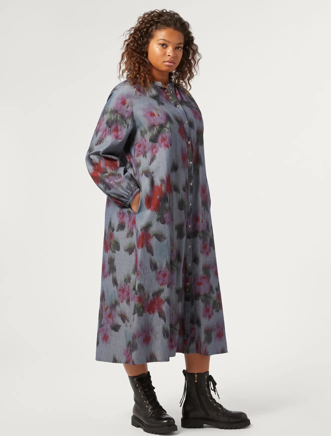 È realizzato in denim chambray di cotone stampato e lavato in capo l’abito chemisier con arricciatura al collo. Perfetto per essere subito pronta.Il capo fa parte della collezione Marina Sport.