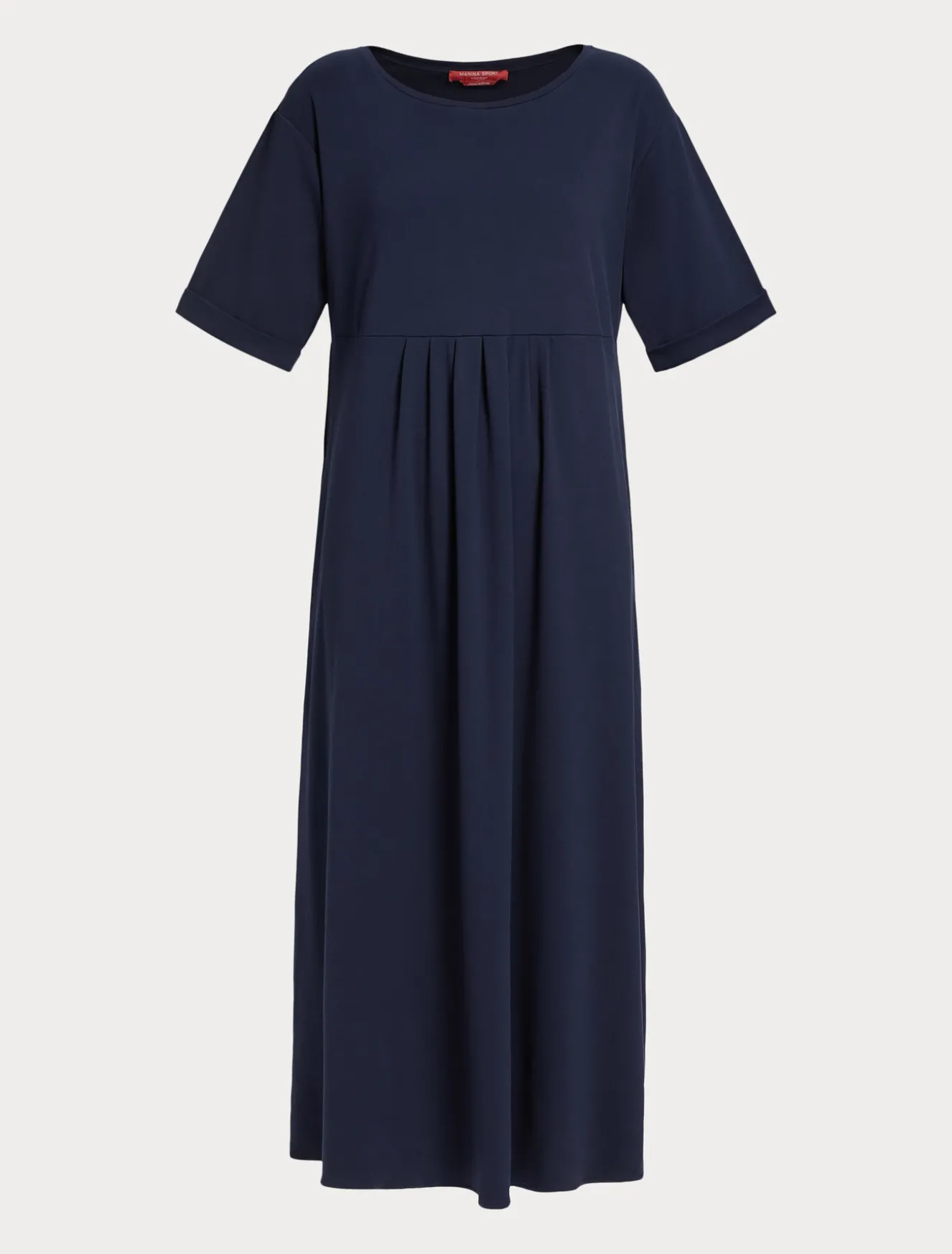 È costruito con taglio a impero, contropieghe e pieghe arricciate l’abito lungo in jersey interlock. Linea femminile da indossare nei momenti casual.Il capo fa parte della collezione Marina Sport.