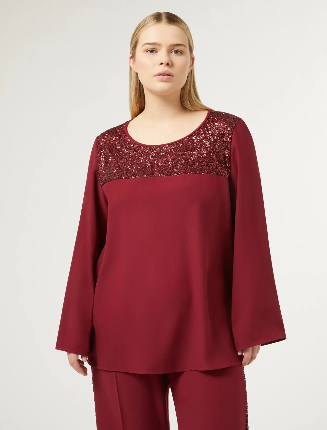 Dettagli stand-out per la blusa in crêpe envers satin rifinita al carré in luminose paillettes. La linea leggermente svasata è femminile e confortevole. La puoi abbinare al pantalone in coordinato.Il capo fa parte della collezione Persona by Marina Rinaldi.