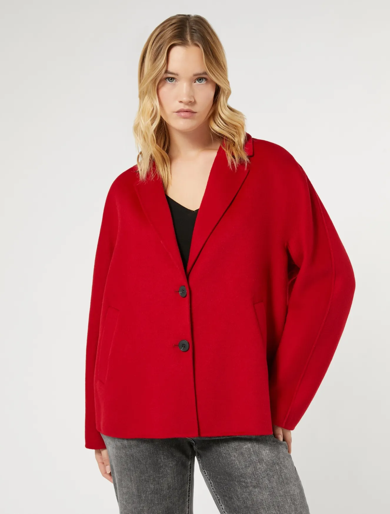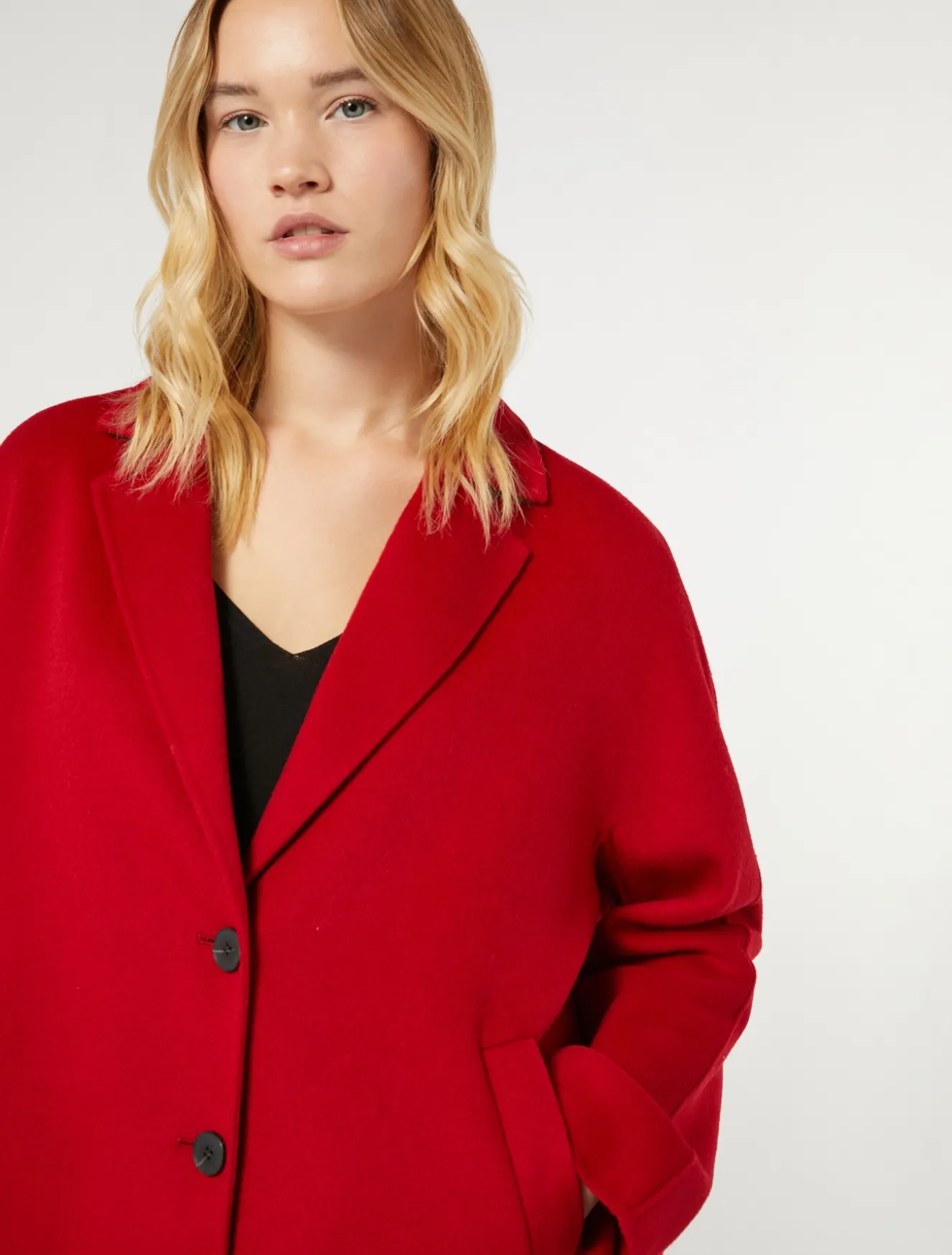 Tagli avvolgenti per il caban in double di lana cucito a mano con ampio collo con rever a incorniciare le spalle e maniche lunghe. Le tasche a filetto sono discrete e funzionali.Il capo fa parte della collezione Persona by Marina Rinaldi.