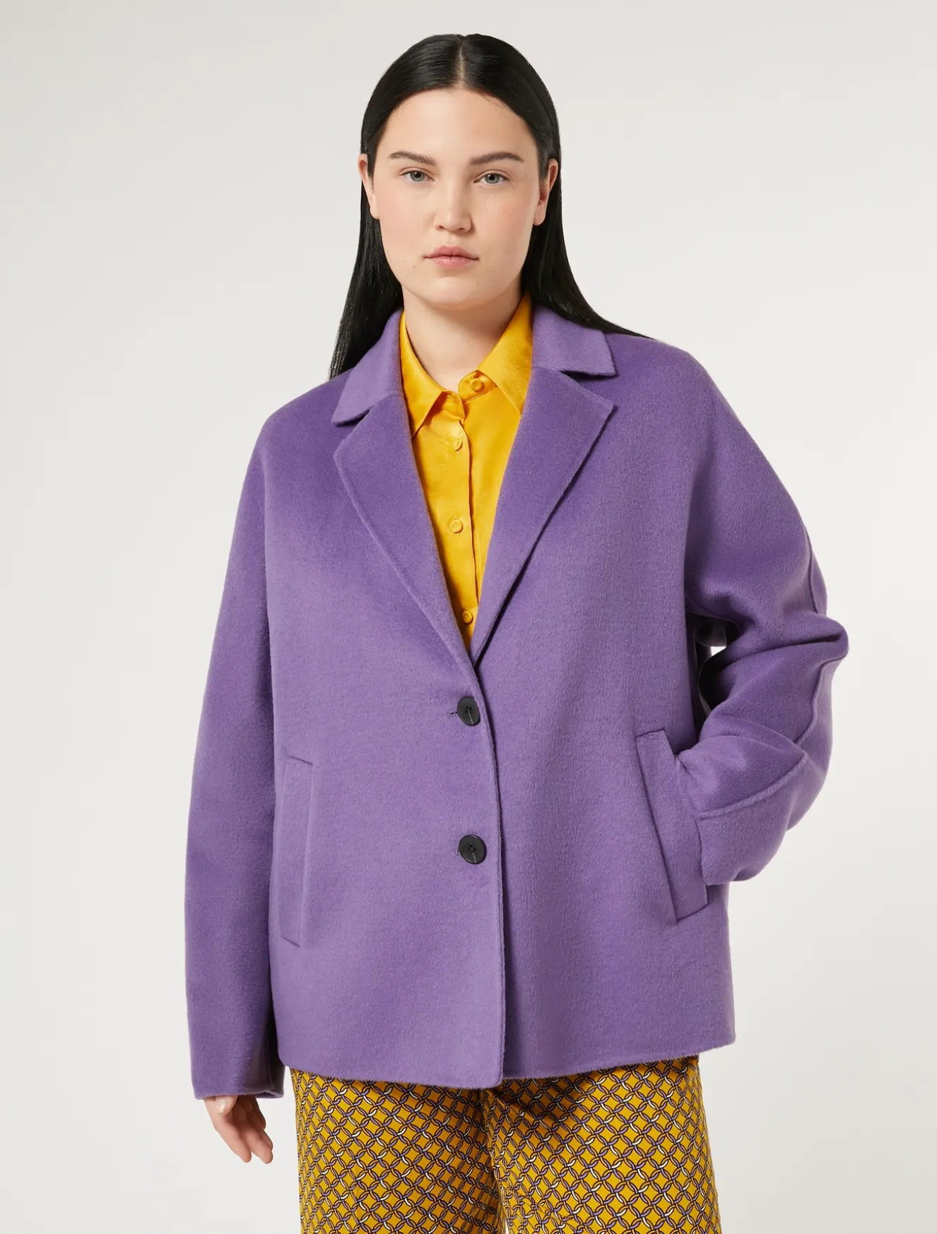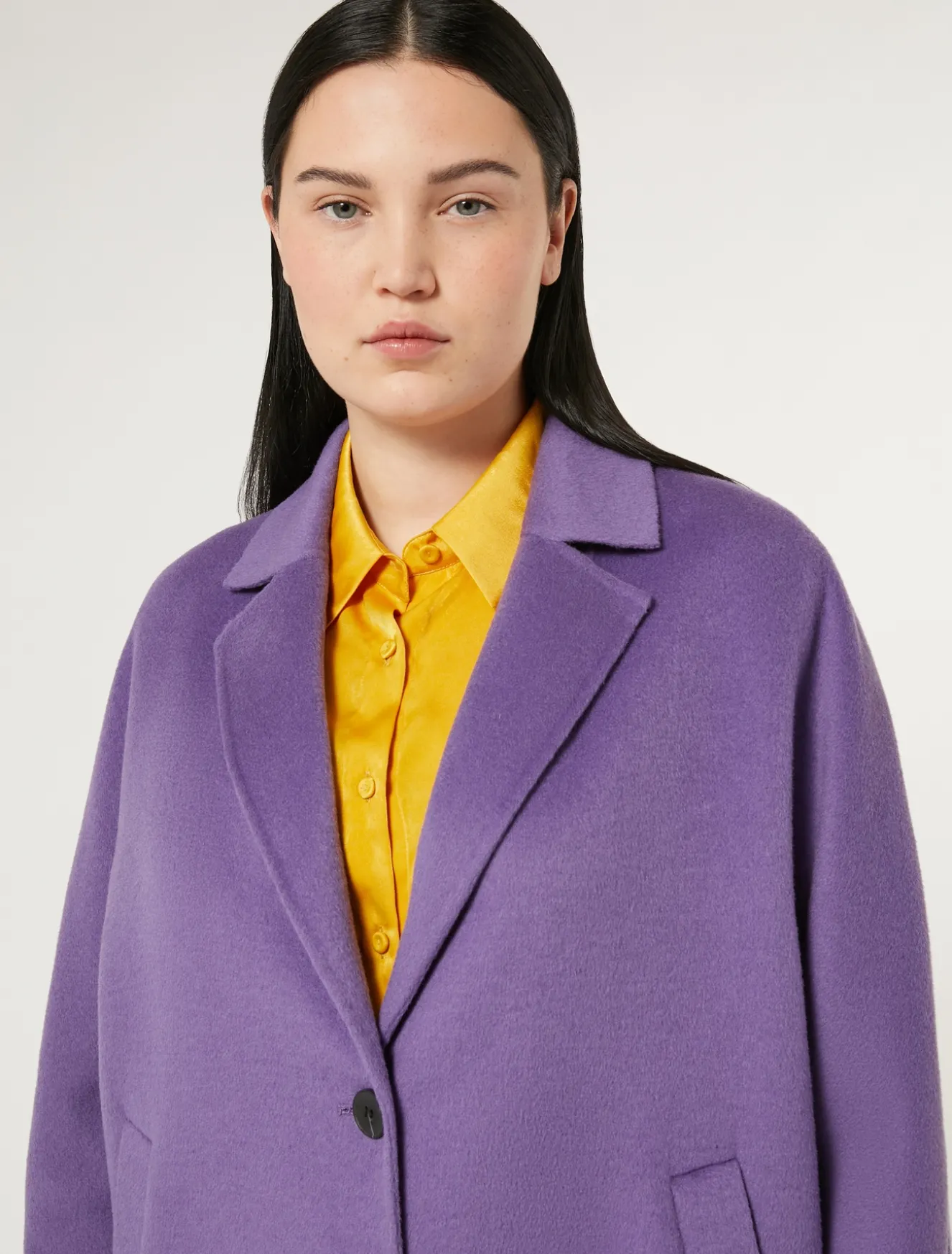 Tagli avvolgenti per il caban in double di lana cucito a mano con ampio collo con rever a incorniciare le spalle e maniche lunghe. Le tasche a filetto sono discrete e funzionali.Il capo fa parte della collezione Persona by Marina Rinaldi.