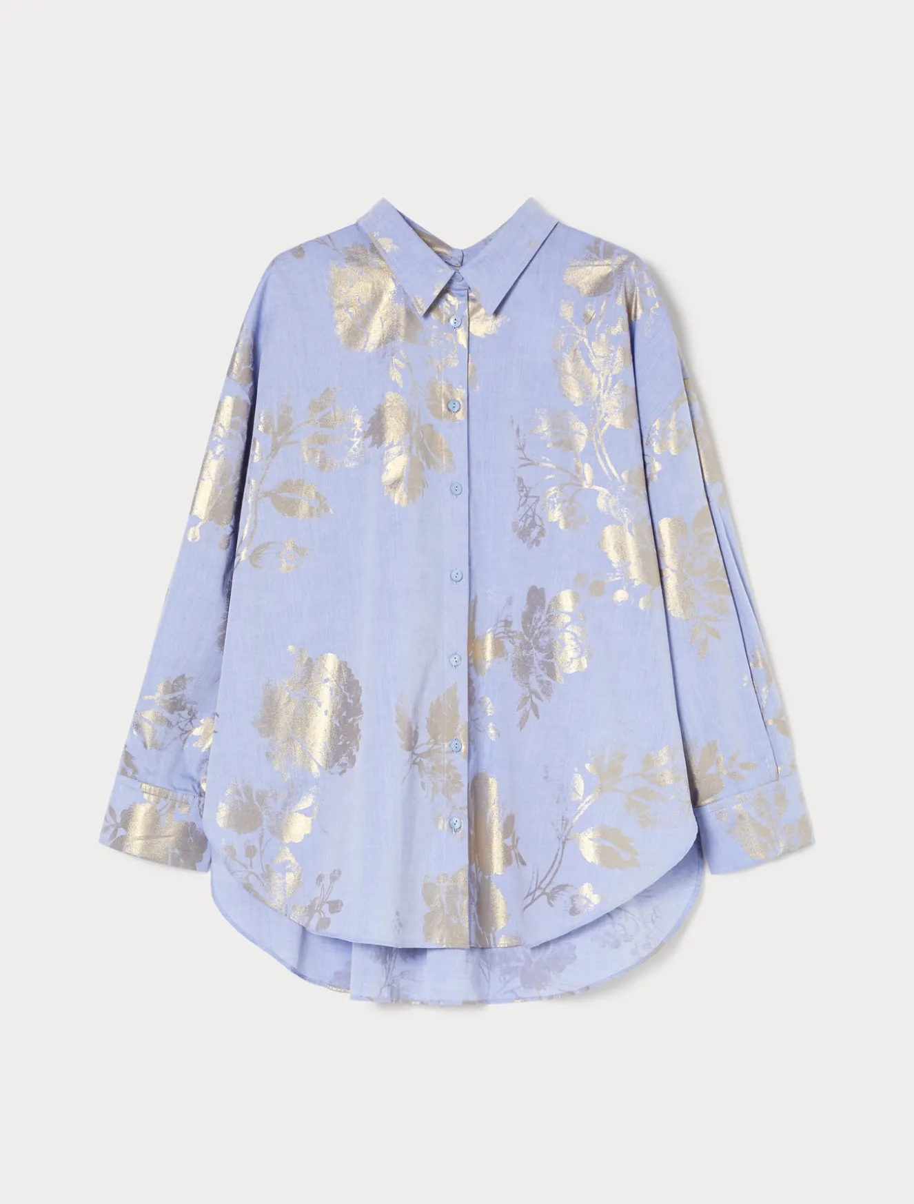 Design speciale per la camicia in chambray di cotone con stampa lamina. La puoi indossare aprendo la scollatura con colletto e bottoni sul retro.
