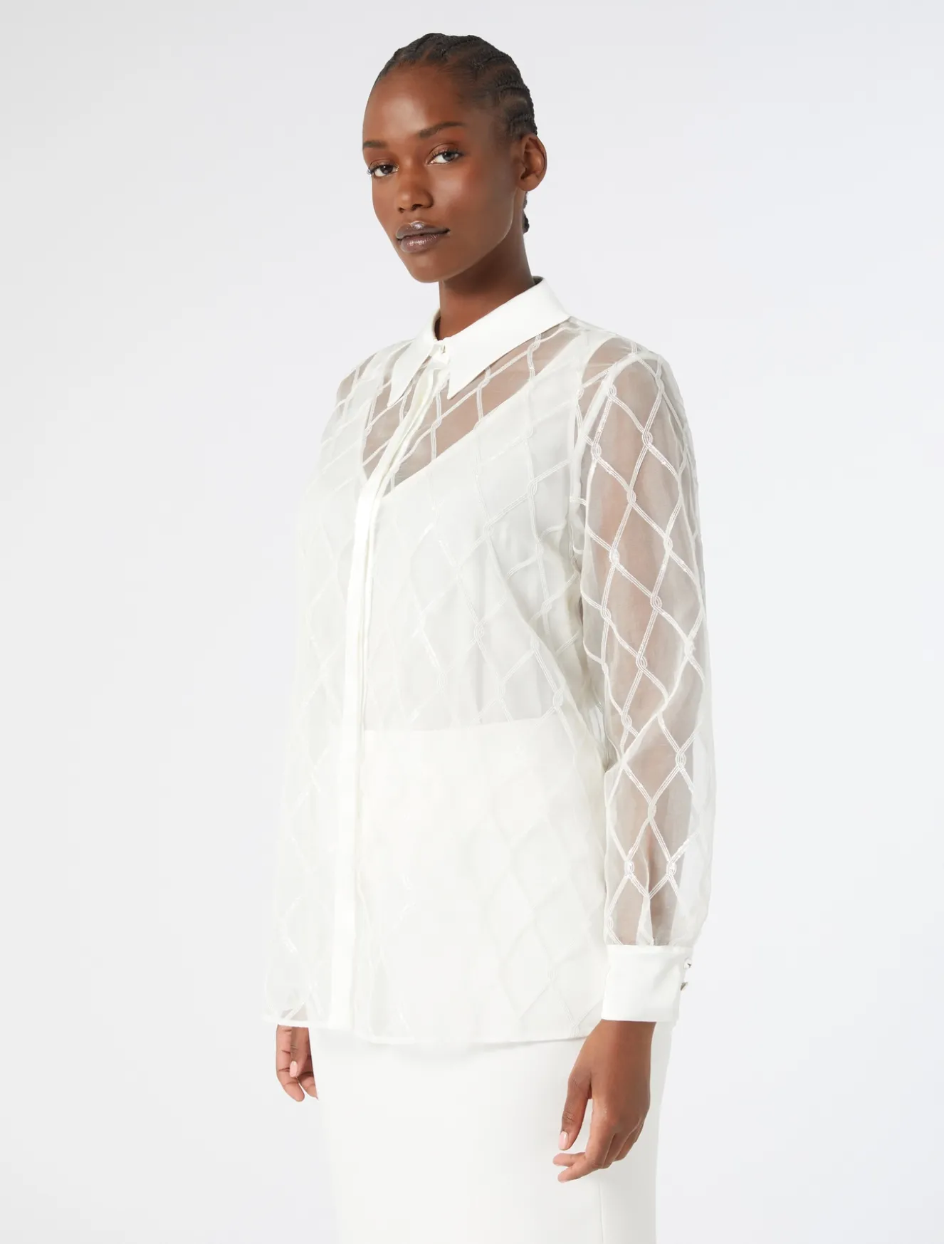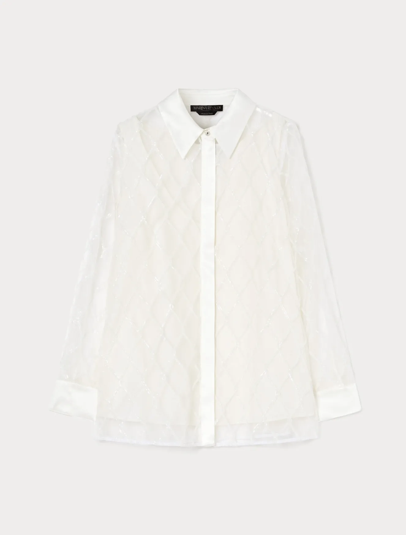 Un intreccio di paillettes con inserti in raso rende unica la camicia in organza di pura seta ricamata. La scelta perfetta per completare i tuoi look da cerimonia.