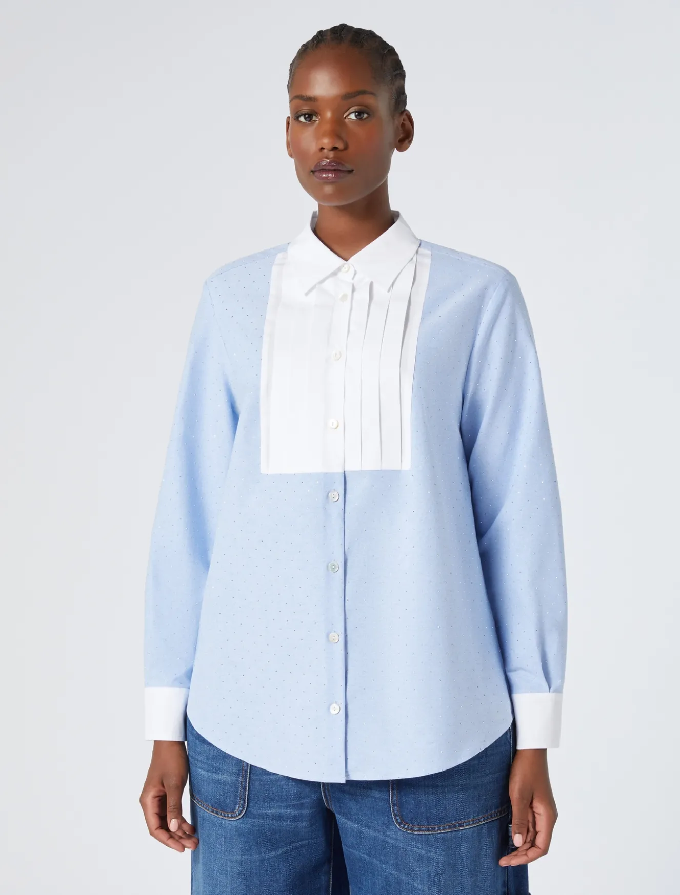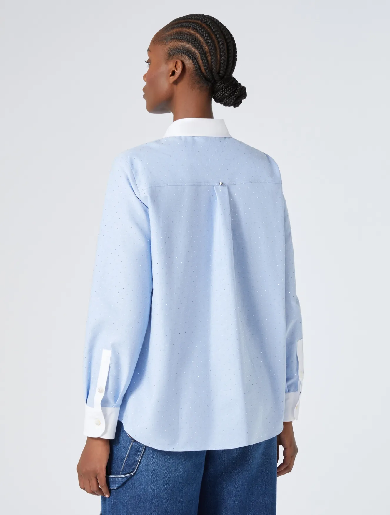 È costruita con dettagli in popeline la camicia in Oxford di cotone con microtermoadesivi sfacettati in metallo, dalla linea dritta. Perfetta per completare i look casual con un tocco ricercato.
