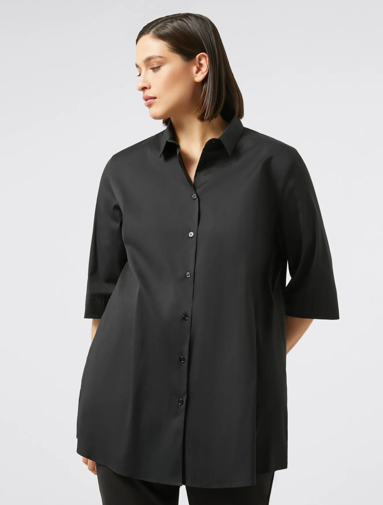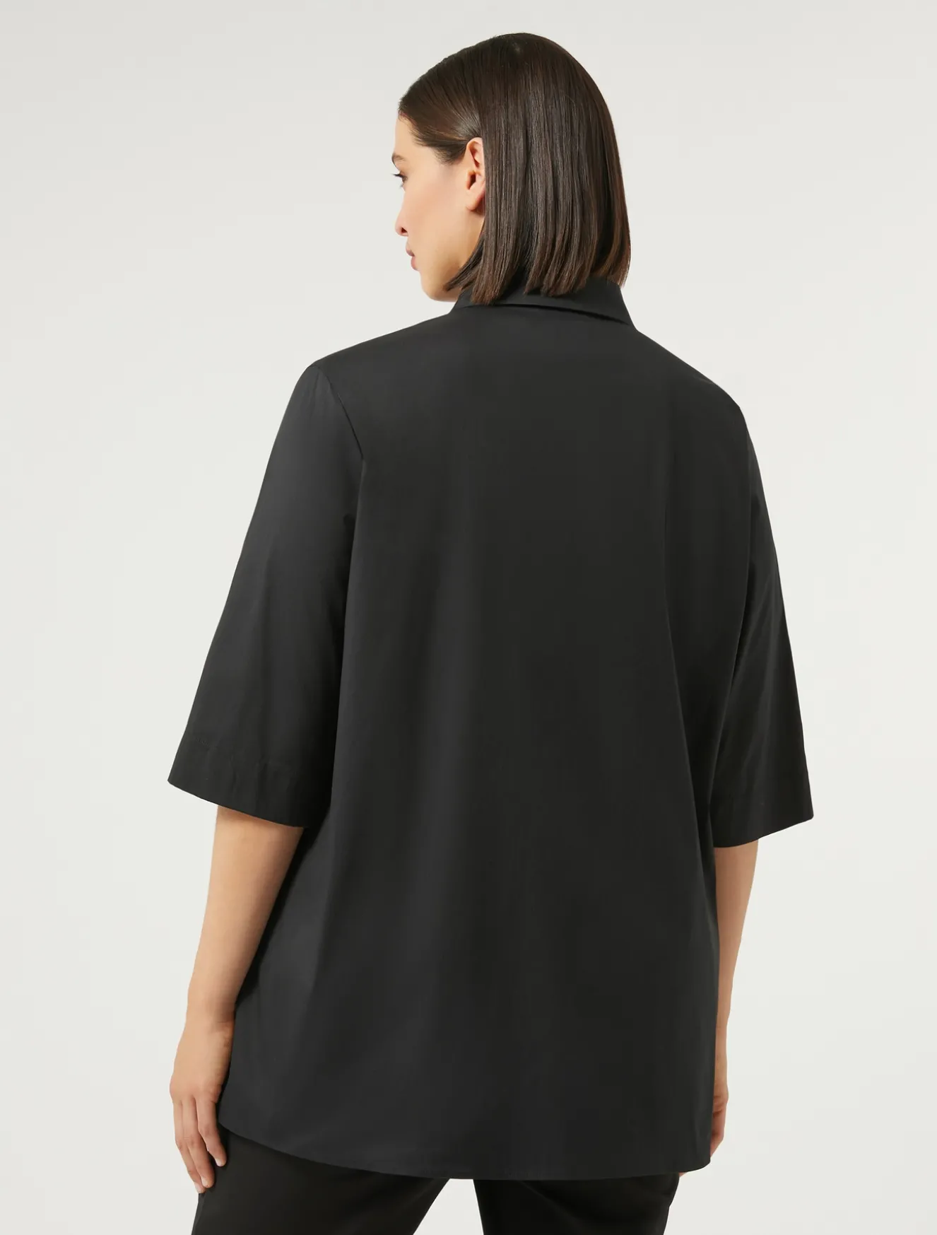 Abbina con facilità la casacca in popeline di cotone e nylon stretch, dalla linea dritta. Un jolly del guardaroba dall’eleganza essenziale.