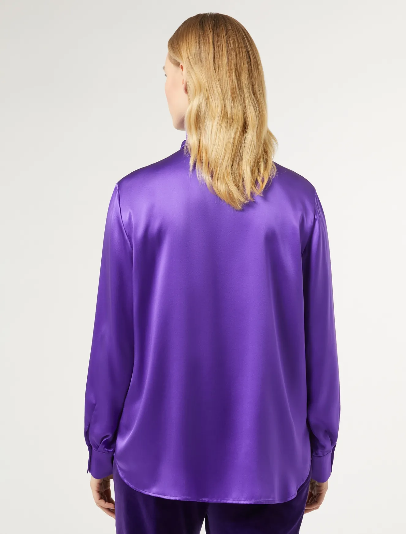 Nel guardaroba non può mancare questa camicia in raso di pura seta con collo a fusciacca da annodare a fiocco. Perfetta da interpretare in una miriade di stili.Il capo fa parte della main collection Marina Rinaldi.