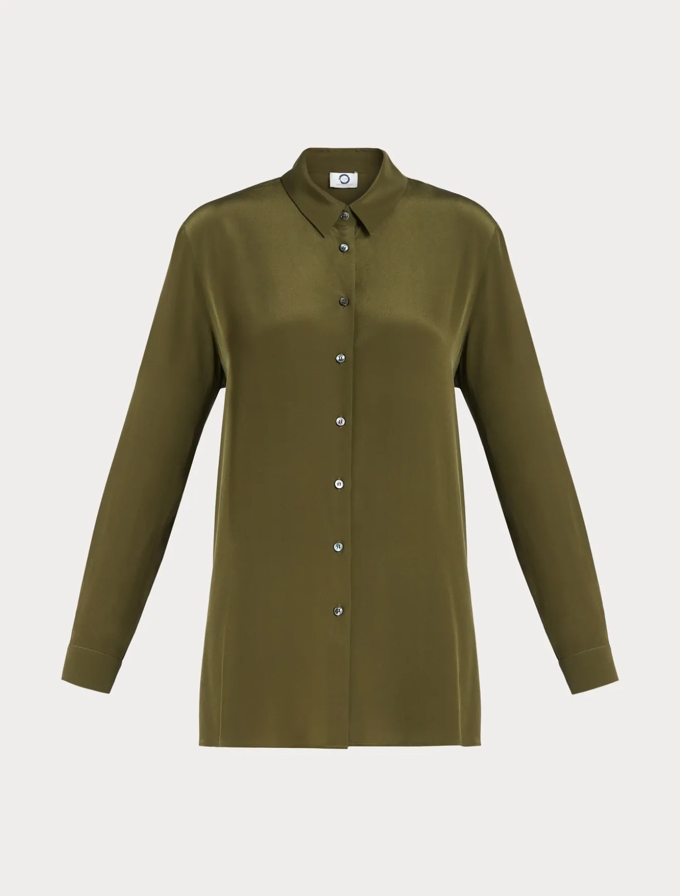 Raffinato crêpe de Chine di seta per la camicia, dalla linea dritta. Il tessuto è di facile manutenzione, si può lavare in acqua. Un jolly del guardaroba dall’eleganza essenziale.Il capo fa parte della collezione Voyage.
