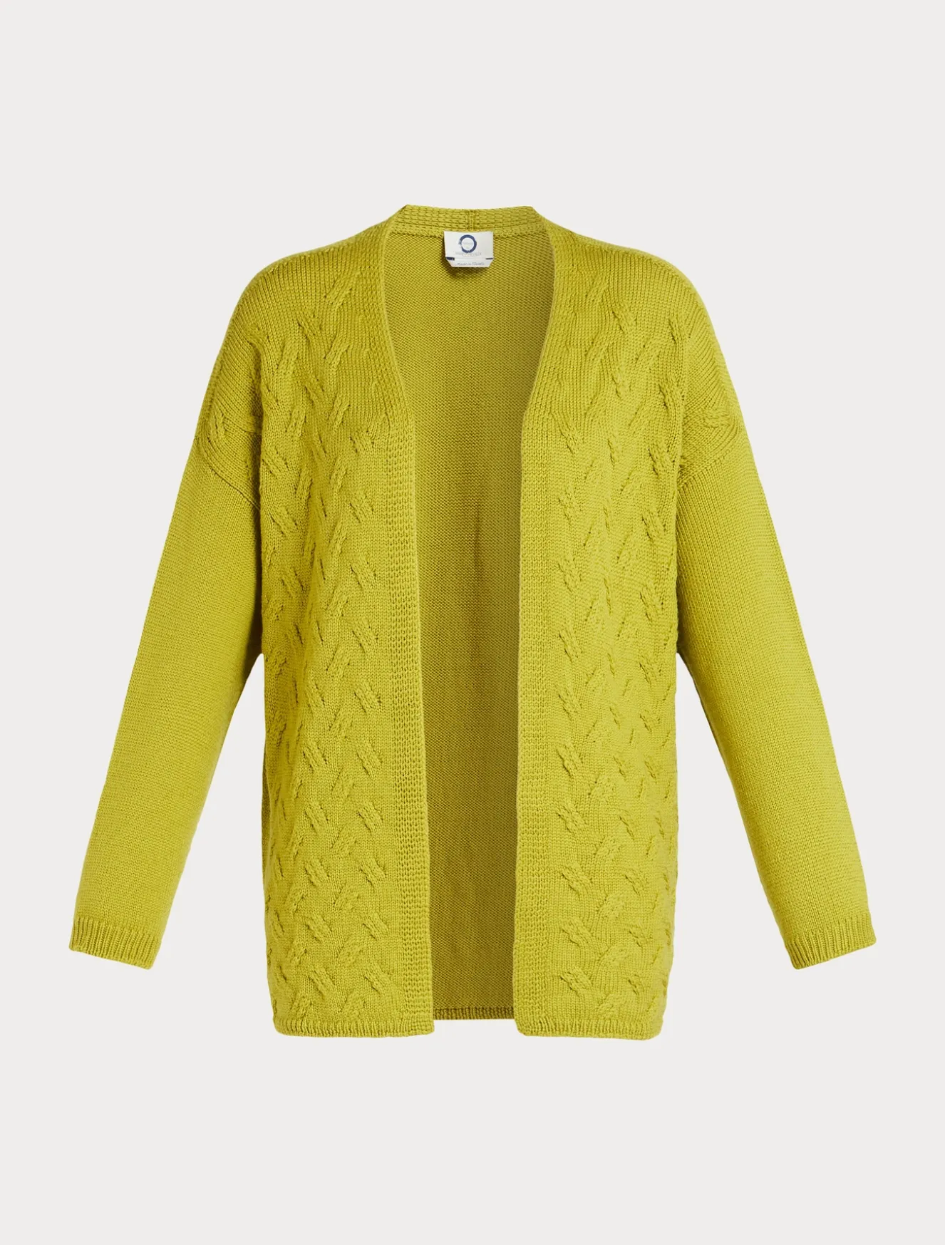 Lavorazione a trecce per il cardigan seamless in catenella di lana. Un modello perfetto anche per completare un look elegante.Il capo fa parte della collezione Voyage.