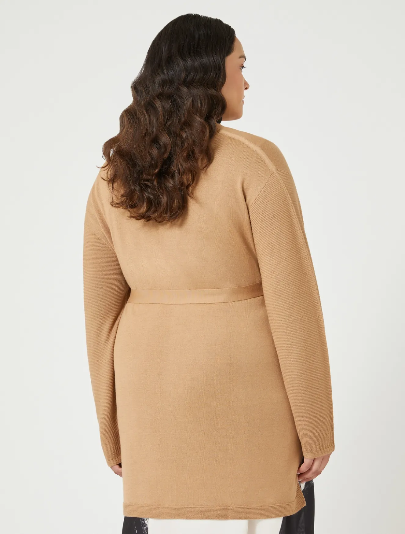 Lavorazione links links a motivo floreale esclusivo per il cardigan in misto lana con cintura in coordinato.Il capo fa parte della main collection Marina Rinaldi.