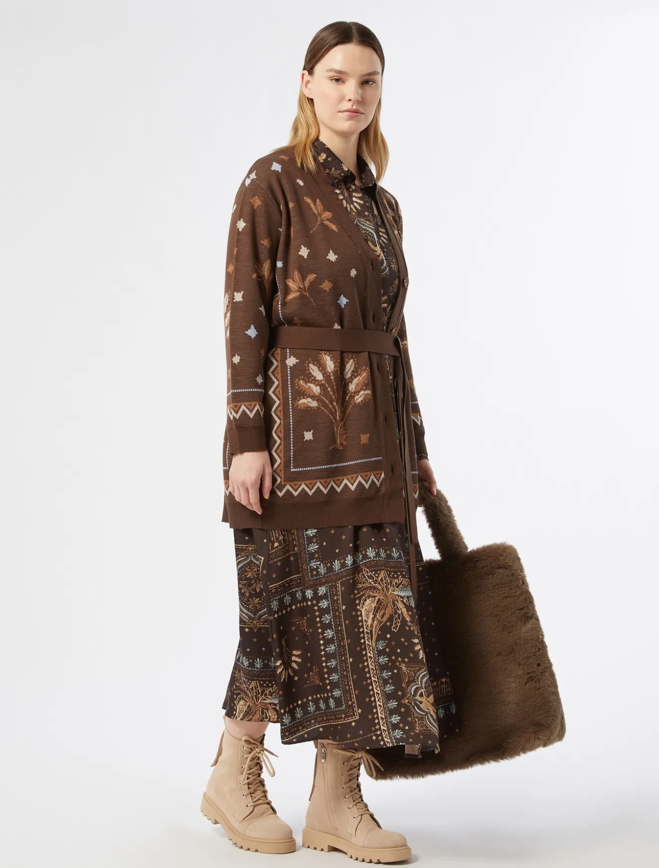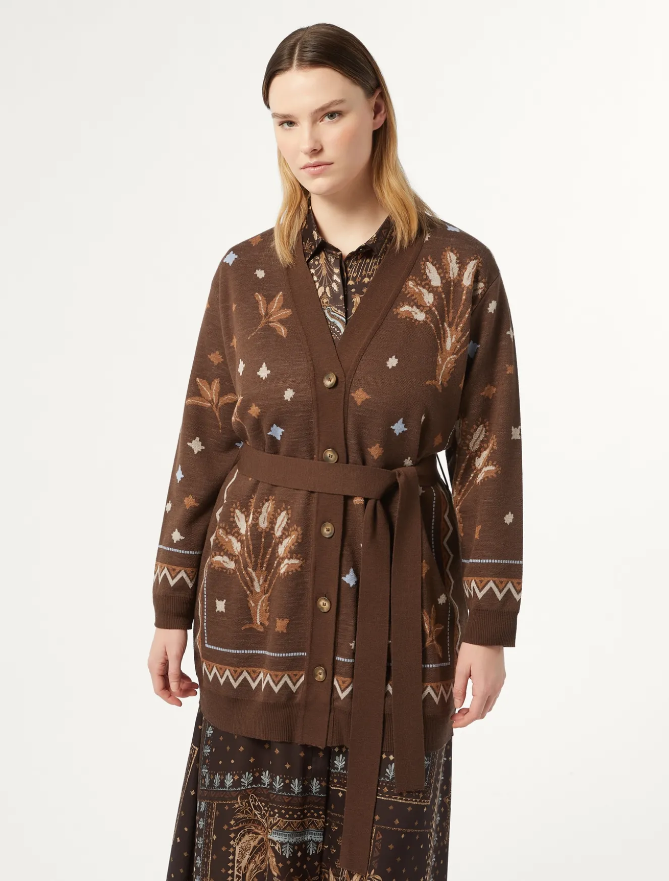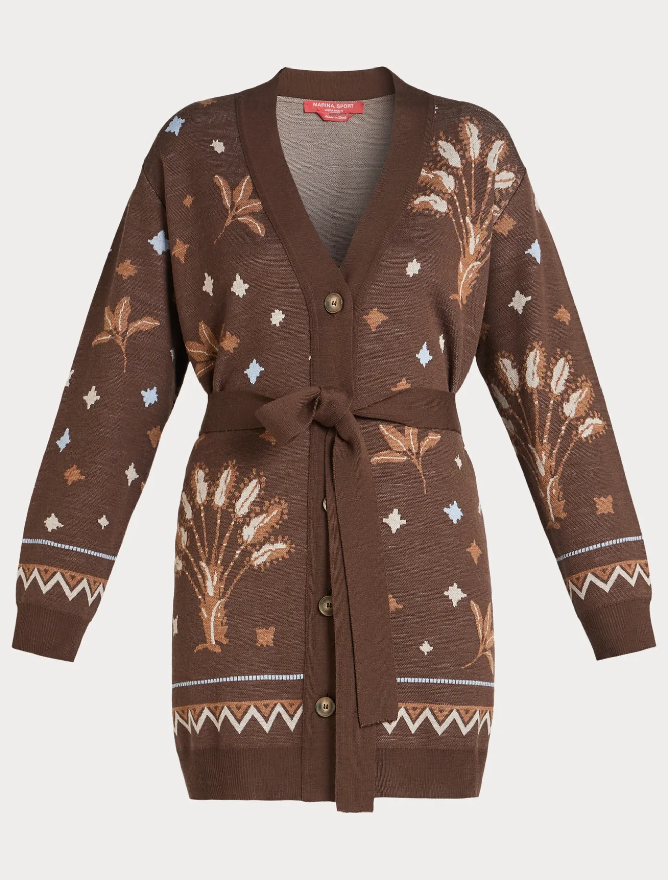 Il cardigan in filato di misto lana esibisce una ricercata lavorazione jacquard multicolor. Lo puoi regolare in vita con la cintura in coordinato.Il capo fa parte della collezione Marina Sport.