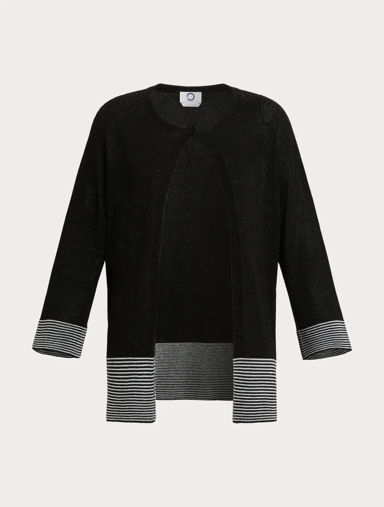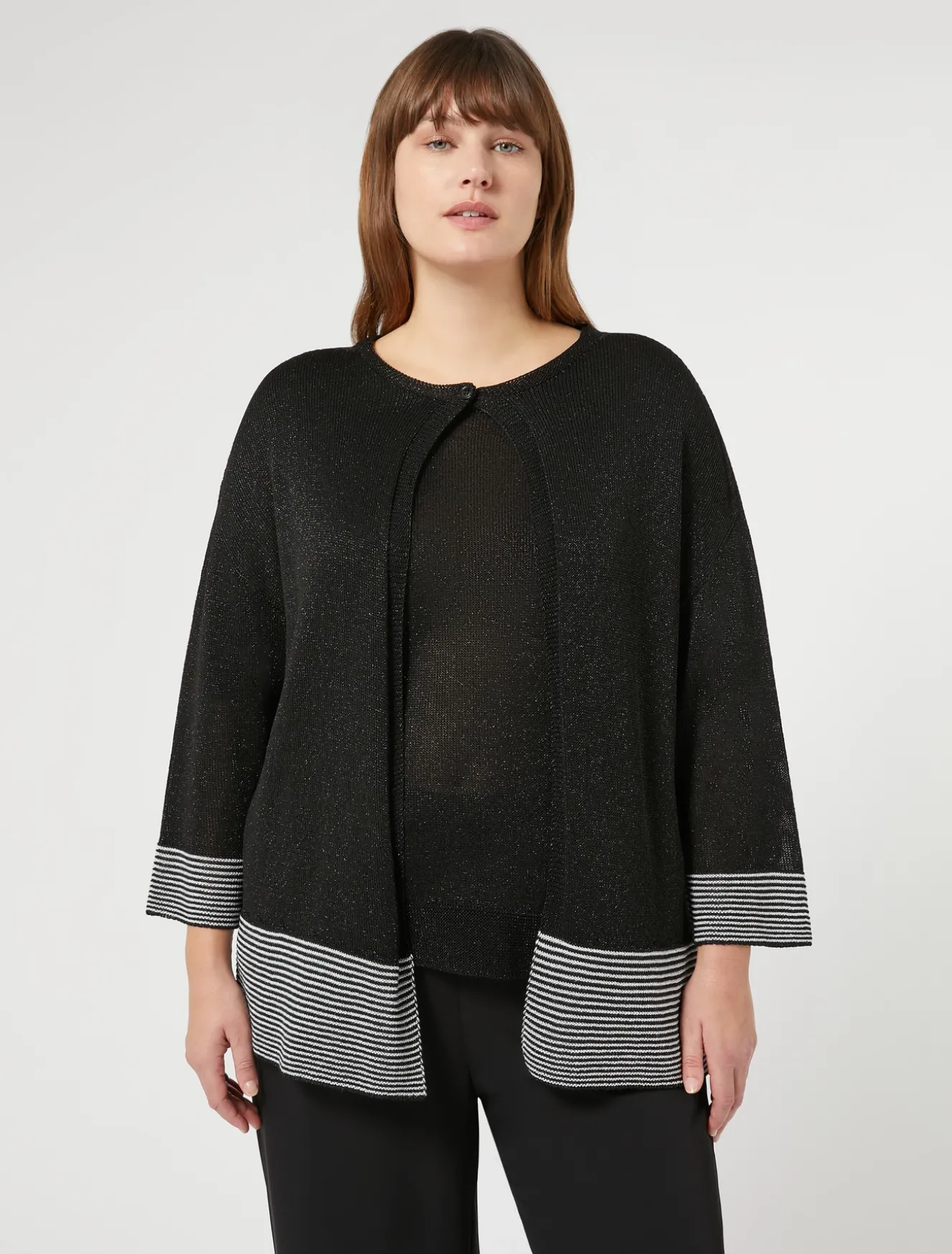 È realizzato in filato di viscosa lurex con lavorazione a righe ai fondi, il cardigan dalla linea dritta. Un modello perfetto anche per completare un look elegante.Il capo fa parte della collezione Voyage.