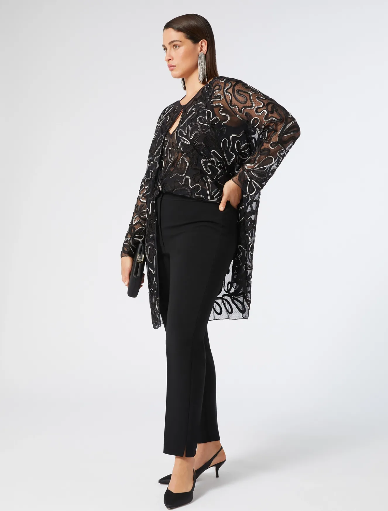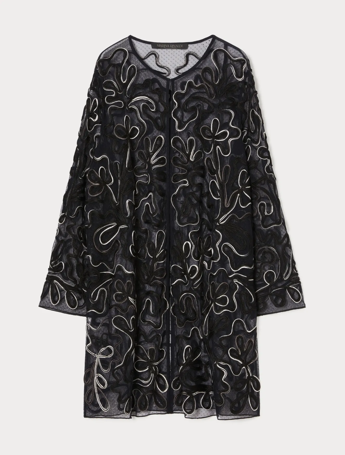 La casacca aperta in tulle plumetis è impreziosita da un ricamo piazzato e studiato sul modello, in Cornely con fettuccia sfumata. Un modello prezioso per elevare in un attimo lo stile.