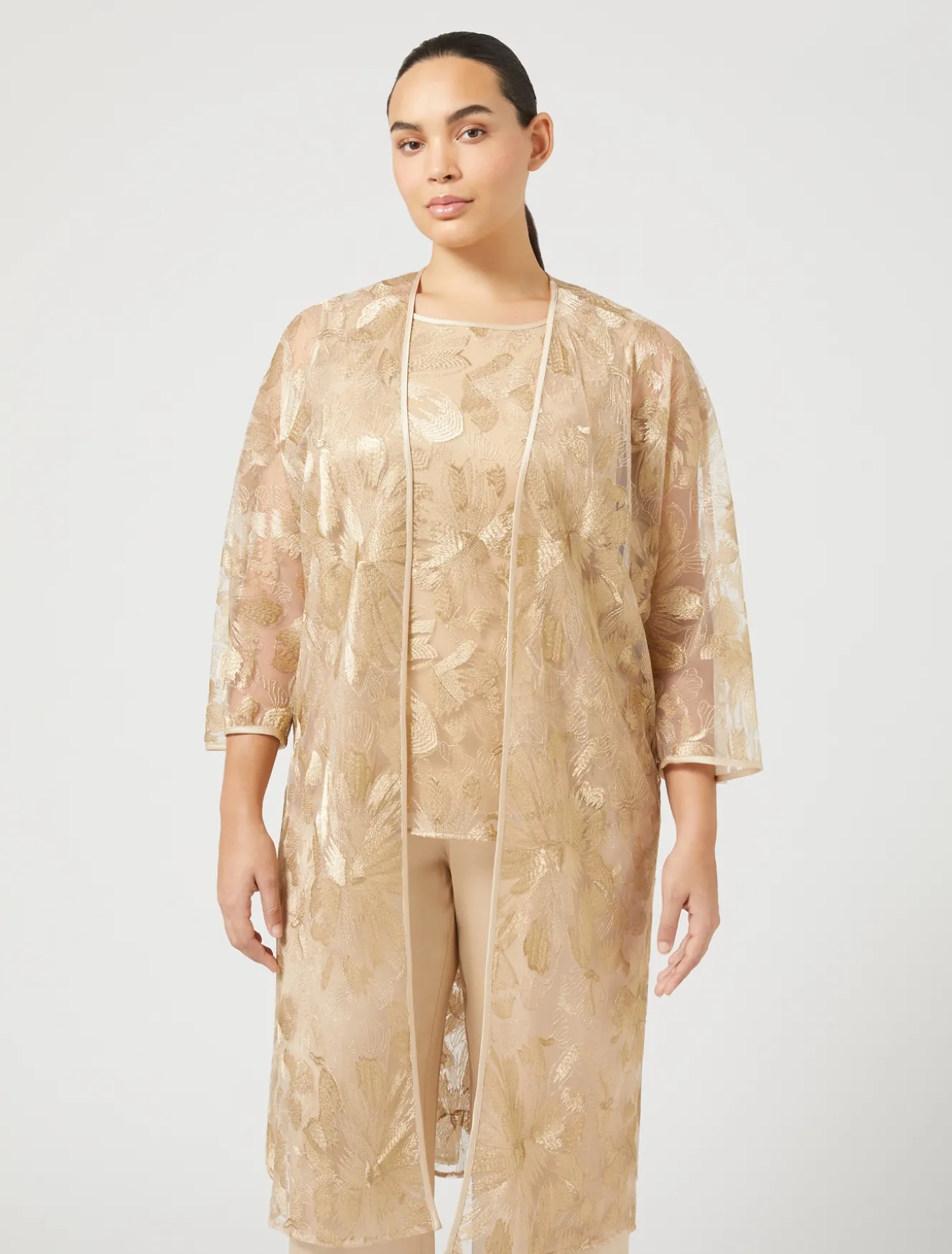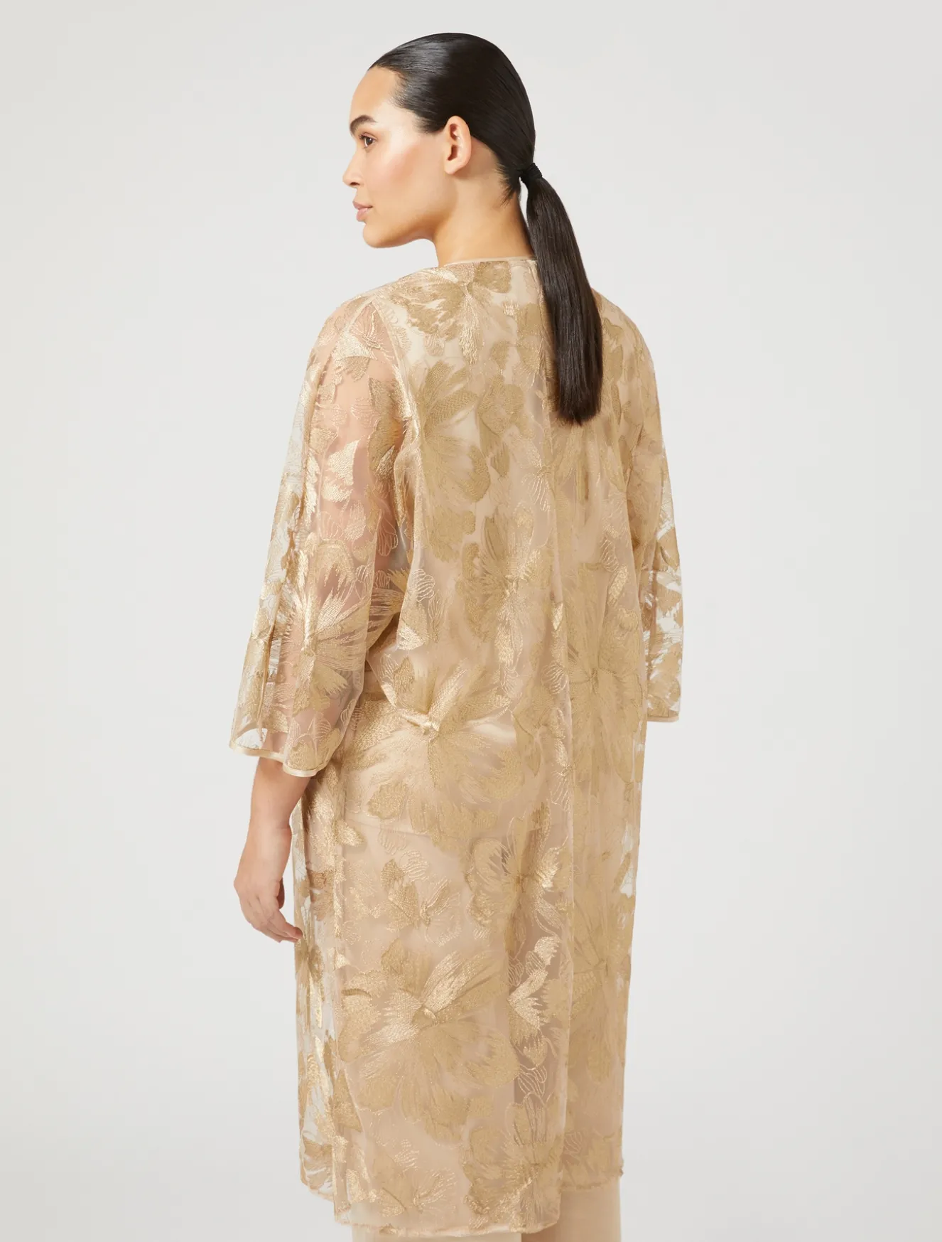 Disegno floreale esclusivo per il ricamo della casacca in tulle con maniche a kimono e profili rifiniti da bordi in gros-grain in tinta. Un modello prezioso e attuale che eleverà ogni mise delle occasioni. Il capo fa parte della collezione Elegante.