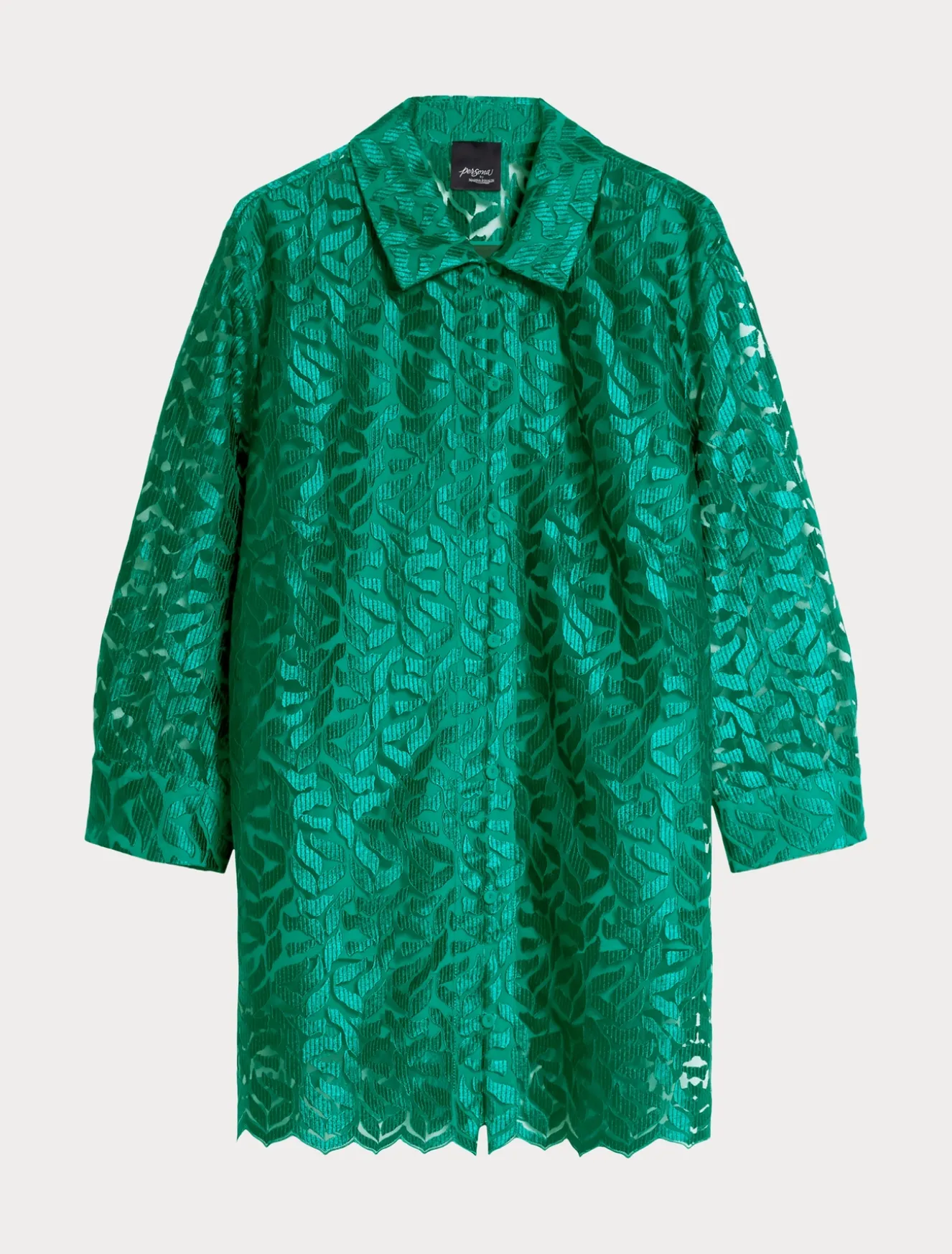 Texture romantiche per la casacca in tulle ricamato con collo a camicia, maniche lunghe, chiusura con bottoncini. Indossala con il top coordinato per più abbinamenti di stile.Il capo fa parte della collezione Persona by Marina Rinaldi.