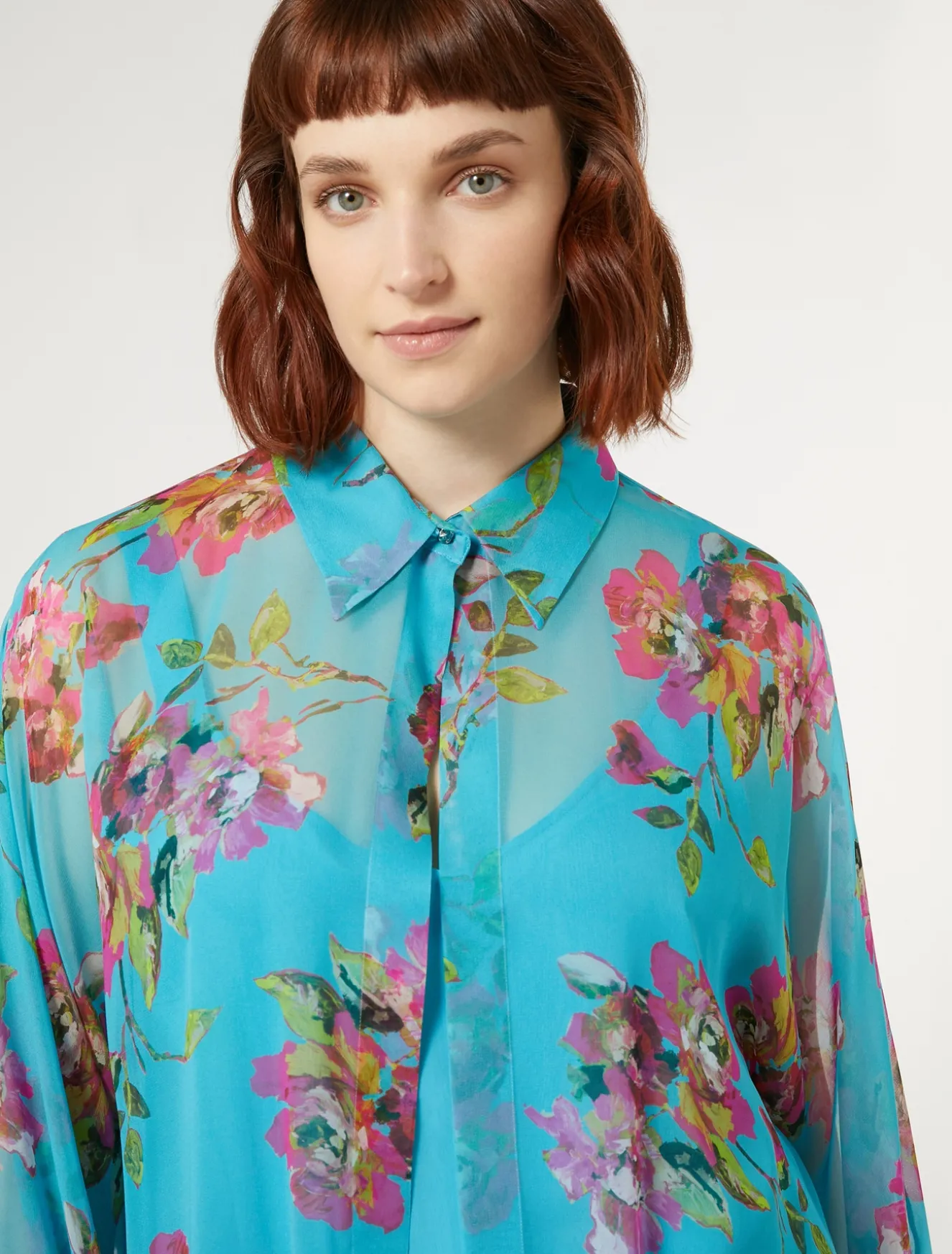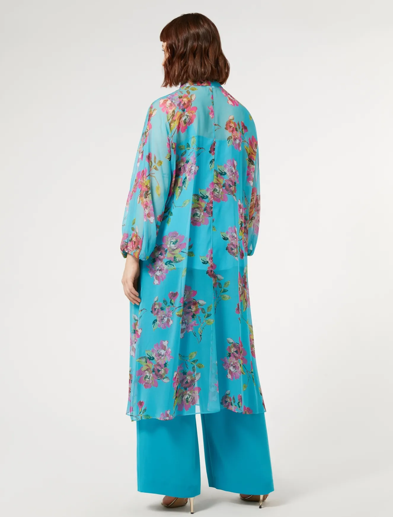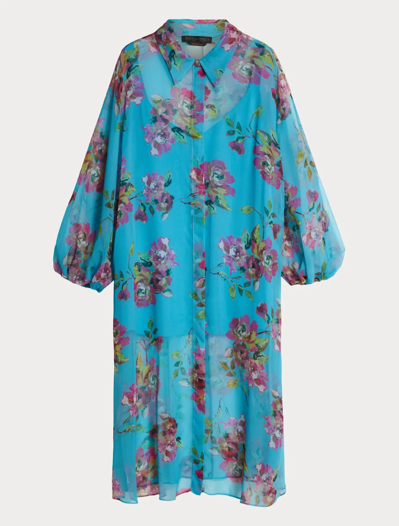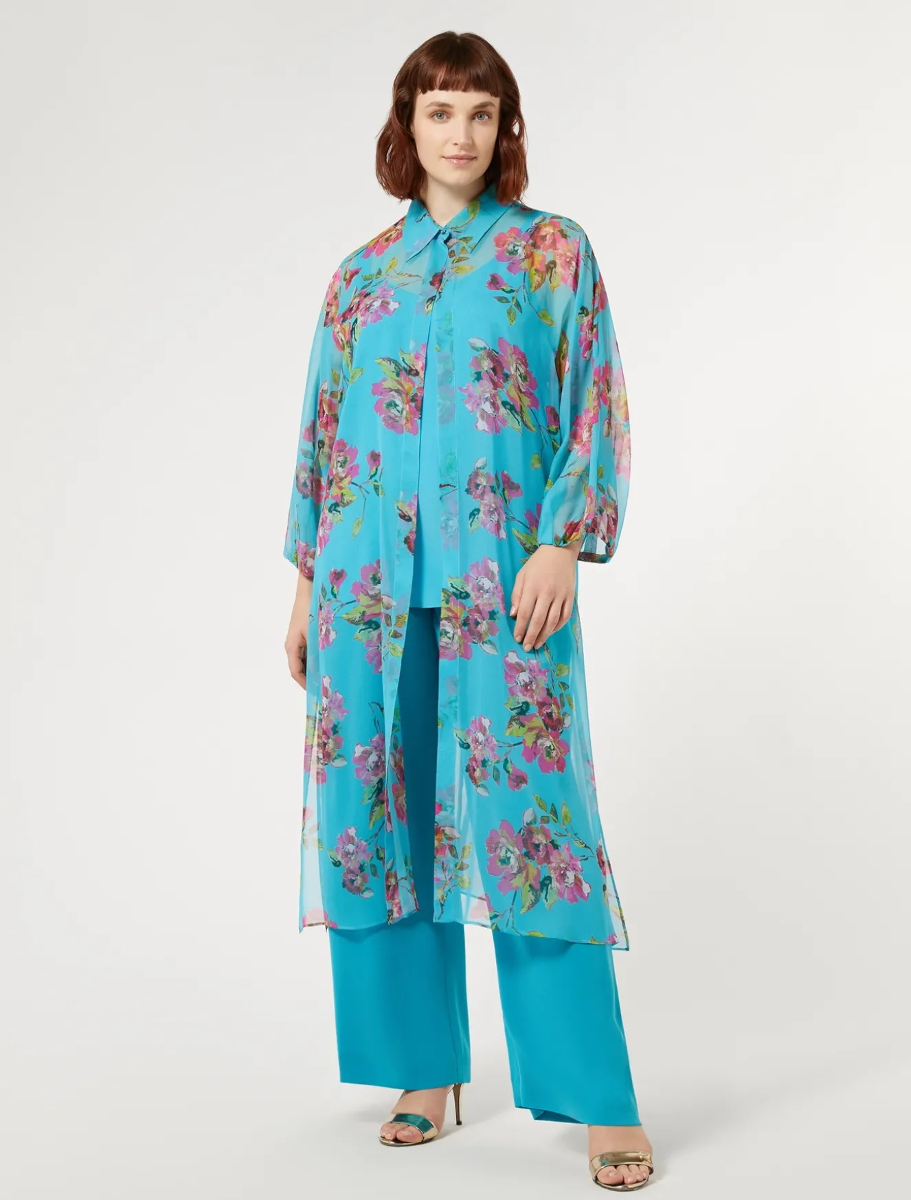 Leggera e impalpabile la casacca lunga in georgette di pura seta con stampa esclusiva a fiori. È abbinata al top in misto seta con spalline. Il capo fa parte della collezione Elegante.