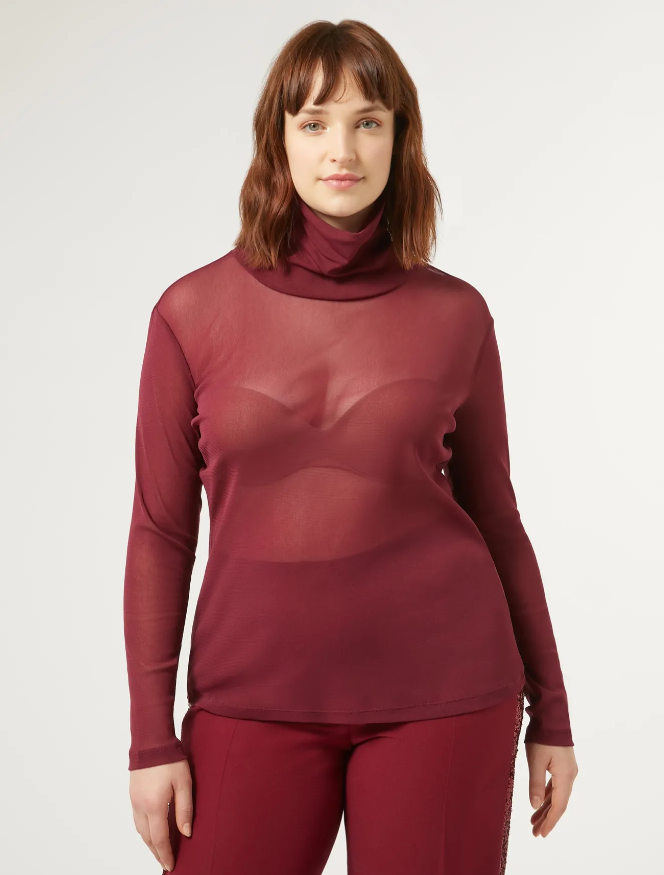 Veste come una seconda pelle il dolcevita in tulle stretch con collo alto e maniche lunghe. Da indossare da solo o come sottogiacca.Il capo fa parte della collezione Persona by Marina Rinaldi.