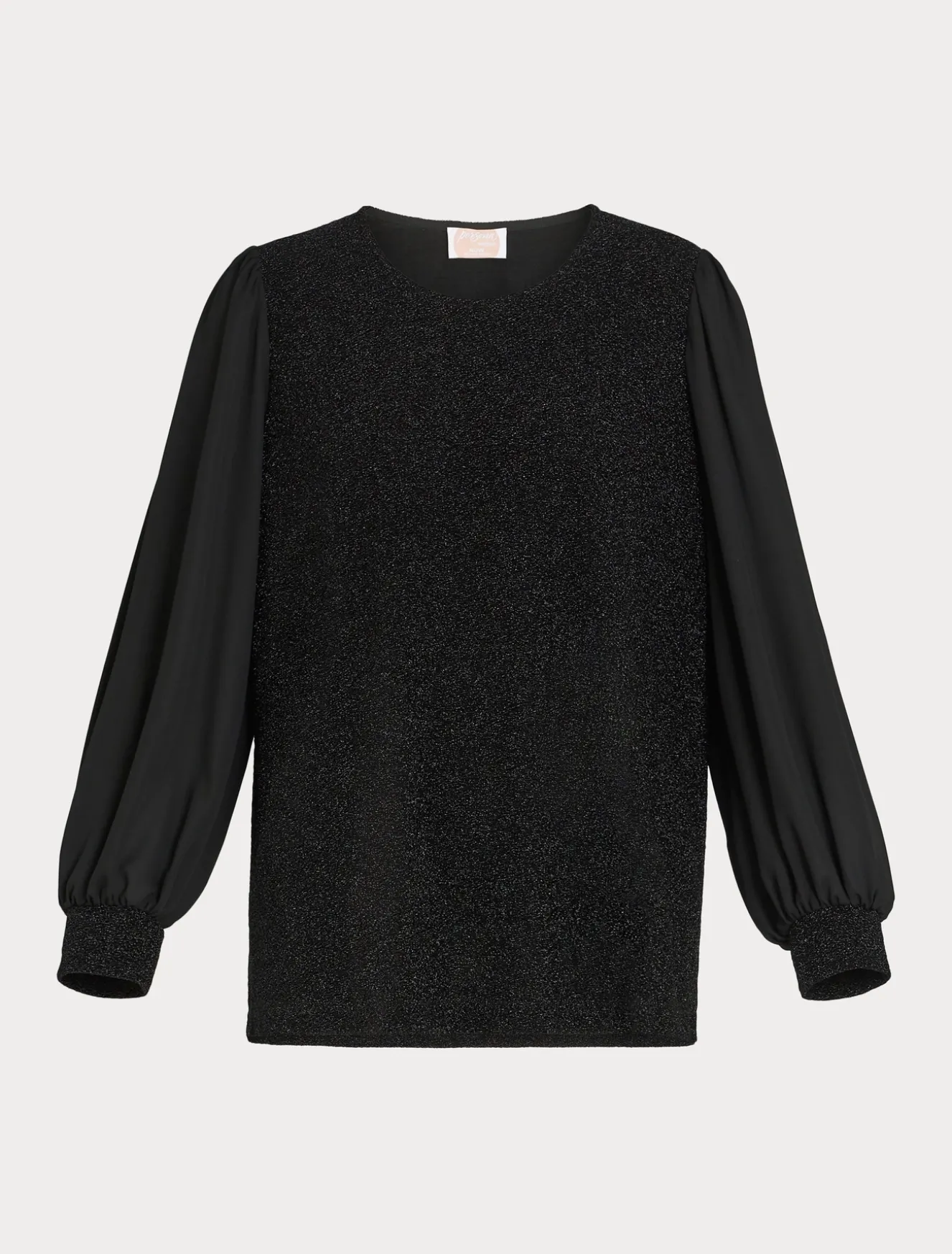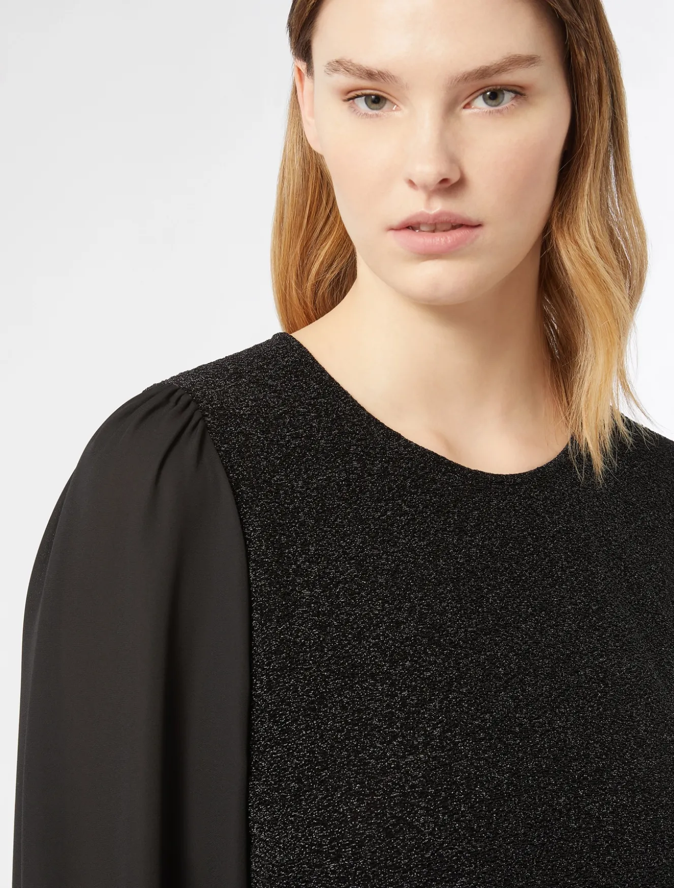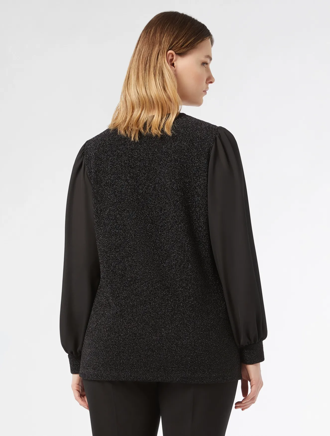 Texture preziose e leggere per la blusa in jersey lamé con maniche in georgette con girocollo, maniche lunghe e spacchetti laterali. Il capo fa parte della collezione NOW by Marina Rinaldi.