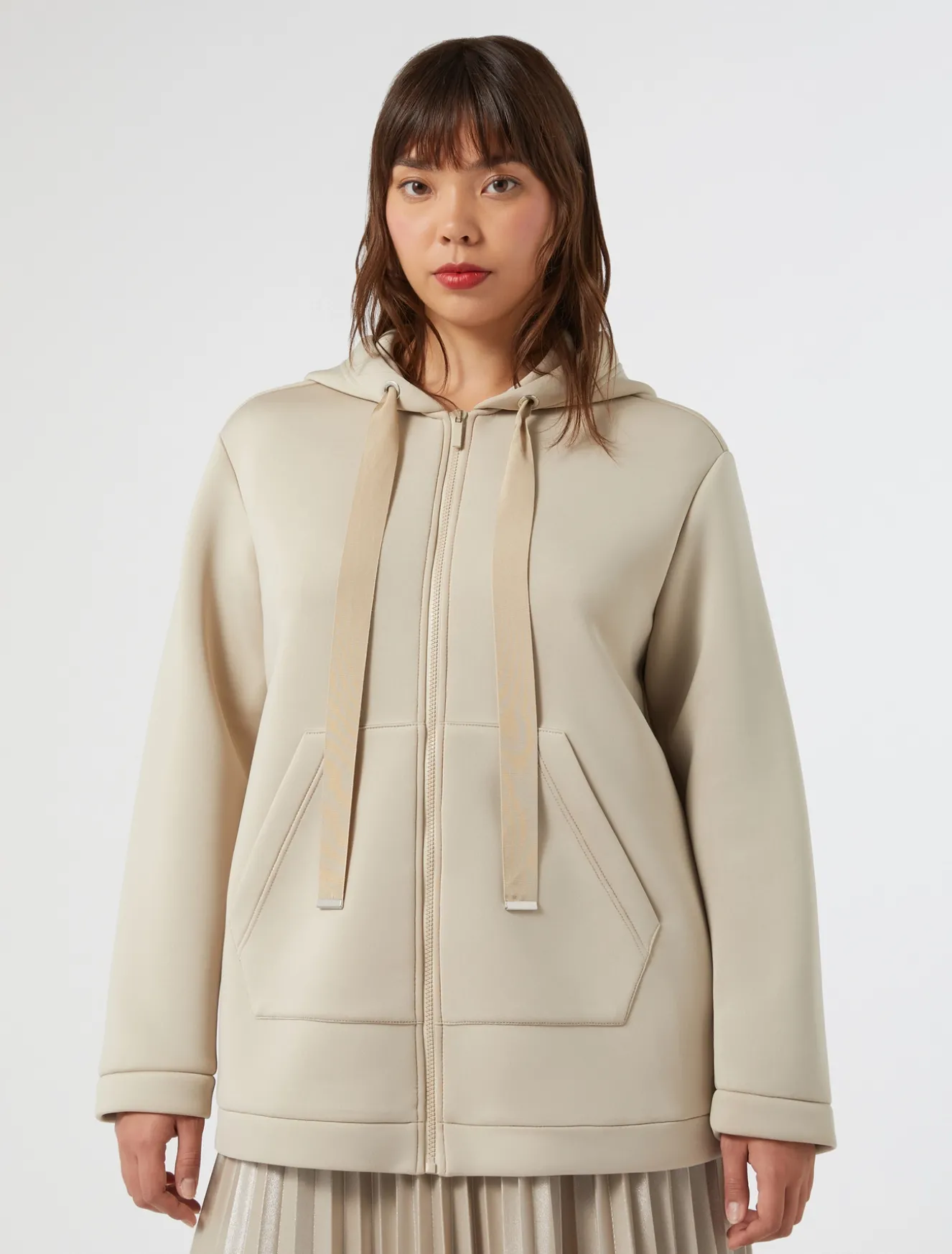 Completa il tuo stile del tempo libero con la felpa in scuba leggero, dalla linea dritta. Ha il collo con cappuccio e coulisse in gros-grain.