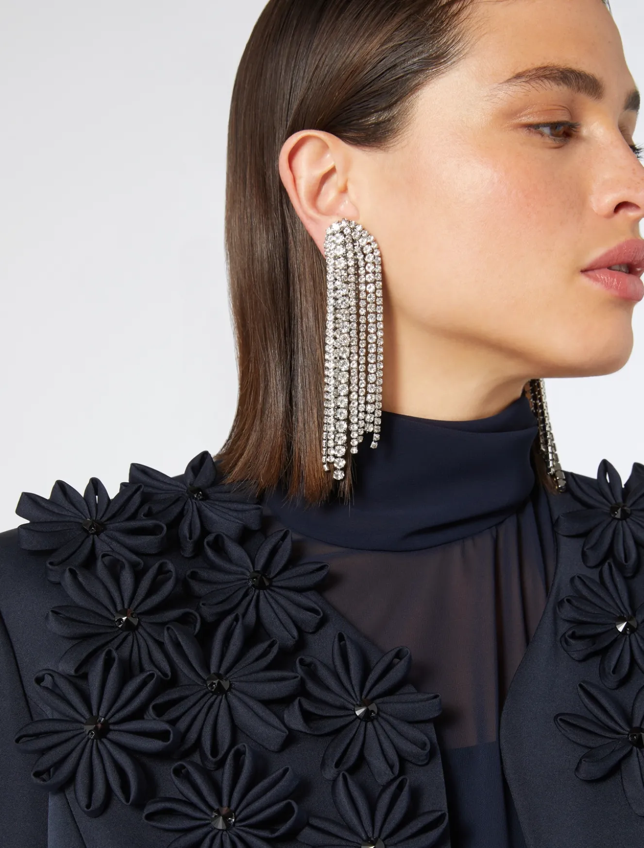 È impreziosita da applicazioni a mano di fiori in tessuto e jais al carré la giacca in duchesse, dalla linea semiaderente. Ricercata e ideale per le occasioni speciali.